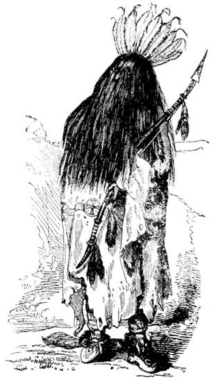 The whole was extremely interesting. The great number of red men, in a variety of costumes, the singing, dancing, beating the drum, &c., while the lofty trees of the forest, illumined by the fires, spread their branches against the dark sky, formed a tout ensemble so striking and original, that I much regretted the impracticability of taking a sketch of it on the spot. When the ceremony had continued a couple of hours, the women began to act their part. A {422} woman approached her husband, gave him her girdle and under garment, so that she had nothing on under her robe; she then went up to one of the most distinguished men, passed her hand over his arm, from the shoulder downwards, and then withdrew slowly from the lodge. The person so summoned follows her to a solitary place in the forest; he may then buy himself off by presents, which, however, few Indians do. This honour was offered to us, but we returned to the lodge, after having made a present, on which pipes were again handed to us. The fires already burnt dim, many Indians had retired, and we asked the old chief, whether we might be permitted to do the same? At first he refused, but, on our repeating the question, he gave us leave. On other occasions, when circumstances allow all the inhabitants of the village to unite, many additional ceremonies take place; more dances are performed, and each of the bands dances that which is peculiar to itself, which could not be done to-day. The dance of the old buffalo bulls,[Pg 31] with entire buffalo skulls, is said to be very interesting. This festival always continues for four successive nights, and, even on this occasion, the rioting and noise continued uninterruptedly throughout the night.