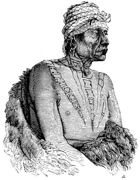 Towards evening, when we descended from the hills to the river, we again came to an extensive wood on the banks, in which one of the winter villages of the Manitaries is situated. We had, however, to walk several miles along a very winding path before we reached it. Being extremely tired, and our feet sore and wounded, it cost us some exertion to get over fallen trunks of trees, sharp stones, &c., in the way. The scenes which are inseparable from the dwellings of the Indians soon appeared; slender young men, galloping without saddle, who were driving their horses home from the pasture; women cutting or carrying wood, and the like. A young Indian joined us, who immediately offered, out of civility, to carry my gun, which I did not accept. He was an Arikkara, who had been captured, when a child, by the Manitaries—a good-tempered, well-behaved young man. He was tall and slender, with a pleasing countenance, long, narrow eyes, and a slightly curved nose.
