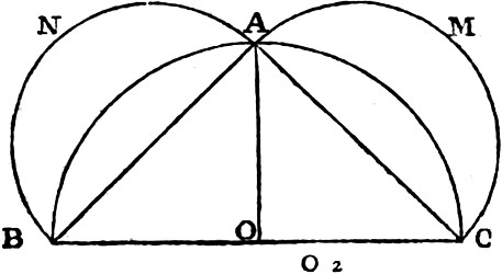 Let A B C be a right-angled triangle, and B A C a semi-circle on the diameter B C: B N A a semi-circle described on the diameter A B; A M C a semi-circle described on the diameter A C. Then the semi-circle B A C is equal to the semi-circle B N A, and A M C together: (because circles are to each other as the squares of their diameters, 31, 6.) If, therefore, you take away the two spaces B A, A C common on both sides, there will remain the two lunulas B N A, A M C, bounded on both sides with circular lines, equal to the right-angled triangle B A C. And if the line B A, be equal to the line A C, and you let fall a perpendicular to the hypotenuse B C, the triangle B A O will be equal to the lunular space B N A, and the triangle C O A will be equal to the lunula C M A. Those who are curious, may see a long account of an attempt of Hippocrates to square the circle, by the invention of the lunulas, in Simplicius on Aristotle’s Physics, lib. i.