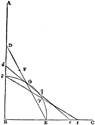 The present very obscure passage, may be explained by the following figure. Let A B C, be a right angle, and D E the line to be moved, which is bisected in G. Now, conceive it to be moved along the lines A B, B C, in such a manner, that the point D may always remain in A B, and the point E in B C. Then, when the line D E, is in the situations d e, δ ε, the point G, shall be in g, γ, and these points G, g, γ, shall be in a circle. And any other point F in the line D E, will, at the same time, describe an ellipsis; the greater axis being in the line A B, when the point F is between D and G; and in the line B C, when the point F is between G and E.
