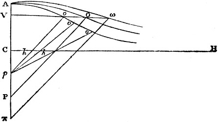 In this curve it is manifest (on account of the right line P O, cutting the rule in H that the point o will never arrive at rule C H; but because h O is perpetually equal to C A, and the angle of section is continually more acute, the distance of the point O from C H will at length be less than any given distance, and consequently the right line C H will be an asymptote to the curve A O.