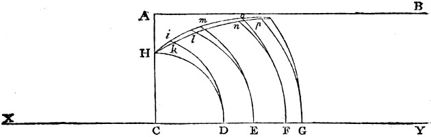 But this singular property is not confined to the conchoid, but is found in the following curve. Conceive that the right line A C which is perpendicular to the indefinite line X Y, is equal to the quadrantal arch H D, described from the centre C, with the radius C D: then from the same centre C, with the several distances C E, C F, C G, describe the arches E l, F n, G p, each of which must be conceived equal to the first arch H D, and so on infinitely. Now, if the points H, k, l, n, p, be joined, they will form a curve line, approaching continually nearer to the right-line A B (parallel to C Y) but never effecting a perfect coincidence. This will be evident from considering that each of the sines of the arches H D, l E, n F, &c. being less than its respective arch, must also be less than the right-line A C, and consequently can never coincide with the right-line A B.