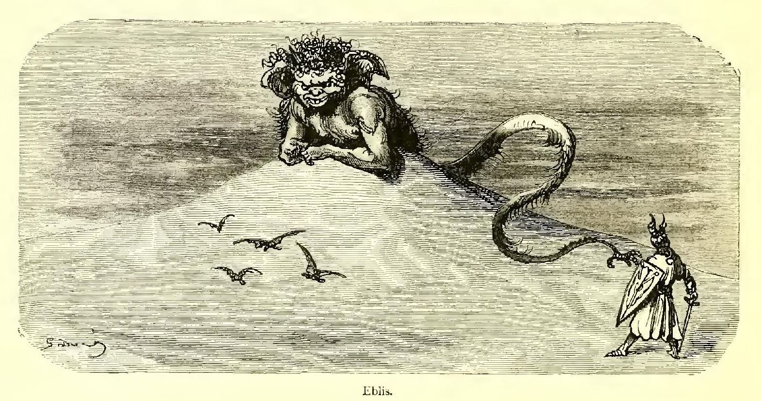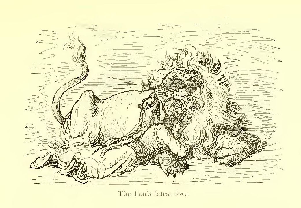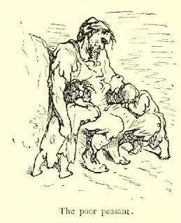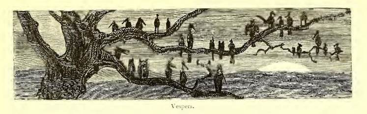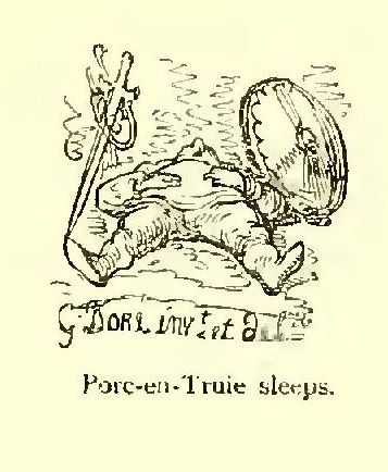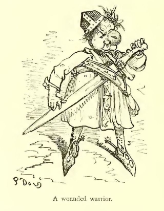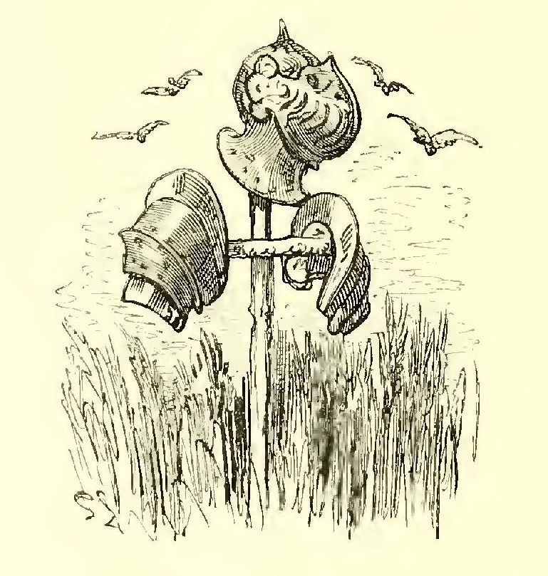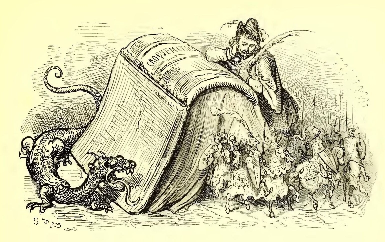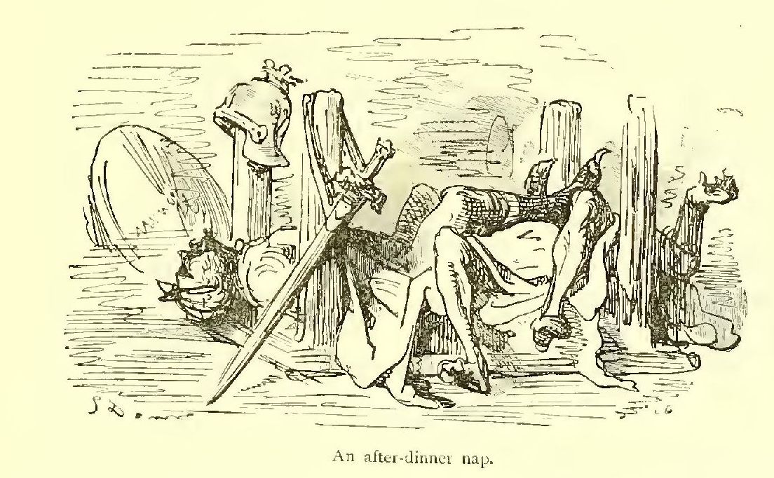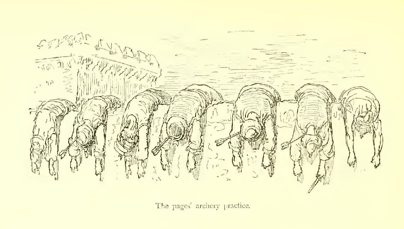 I scarcely know to whom I should appeal as my readers, for the story I have delighted in rendering into English seems to me likely to afford pleasure in the perusal to older heads than those which I am sure would gather over the pages in the nursery. For there are a quiet humour and a delicate fancy running through the legend, amid all the exciting accounts of loves and wars, tourneys and battles, accidents and adventures, which do not lose interest because they are illustrated by the powerful pencil of Gustave Doré. That great artist’s fancy supplies these introductory lines with a tail-piece, which aptly typifies the book. Its author has ably made the doings of knights and paladins point a useful moral as well as adorn an interesting tale, just as the artist makes the arms of the chivalric age serve to frighten the birds from the fields that supply our humble daily bread.