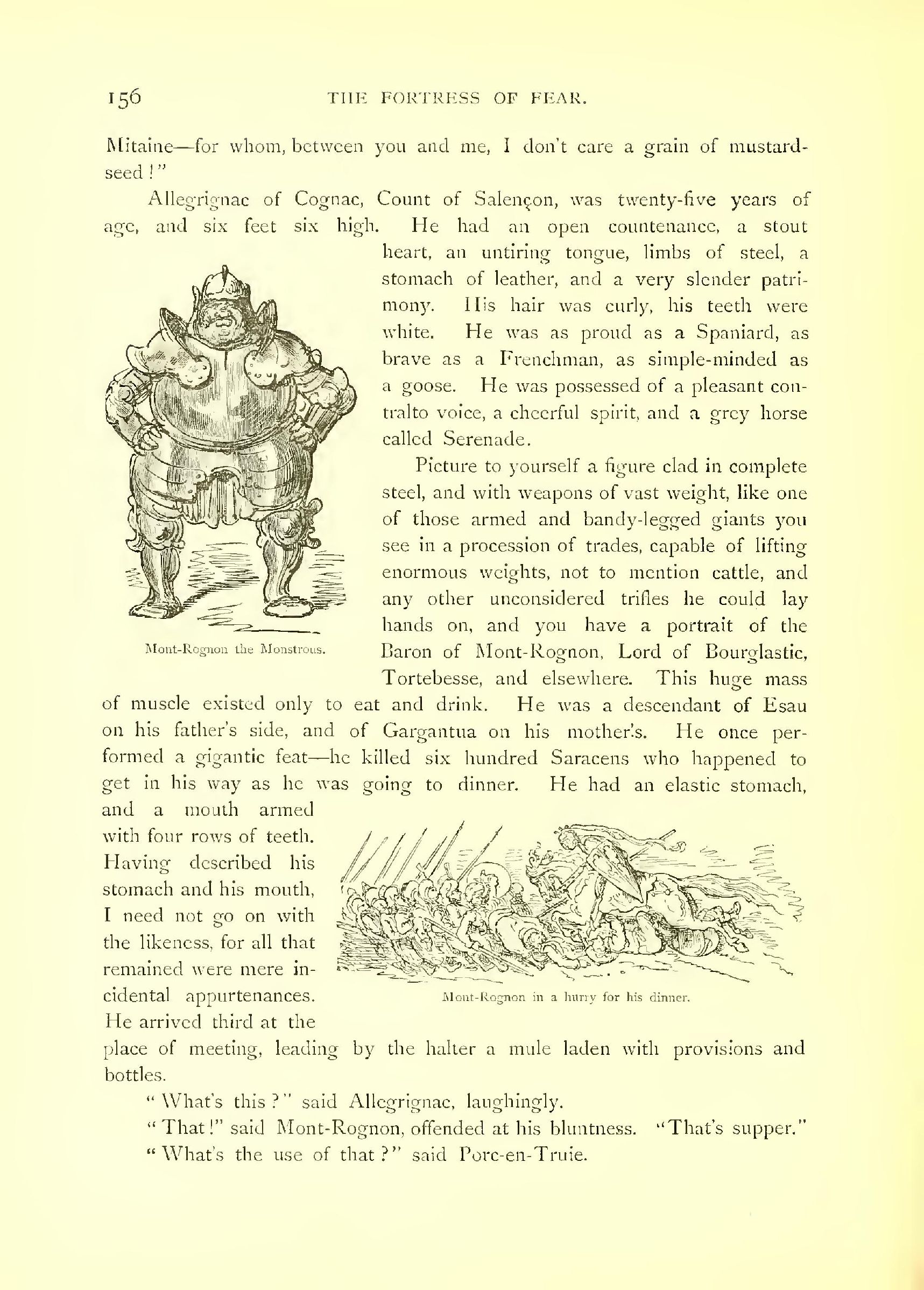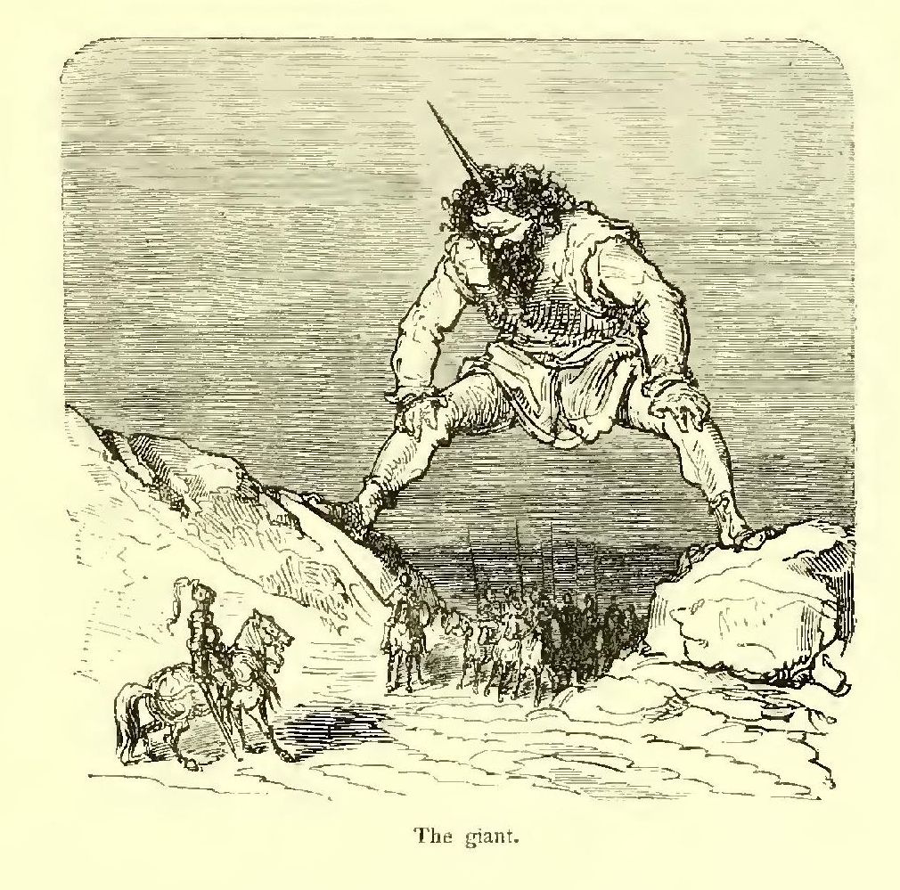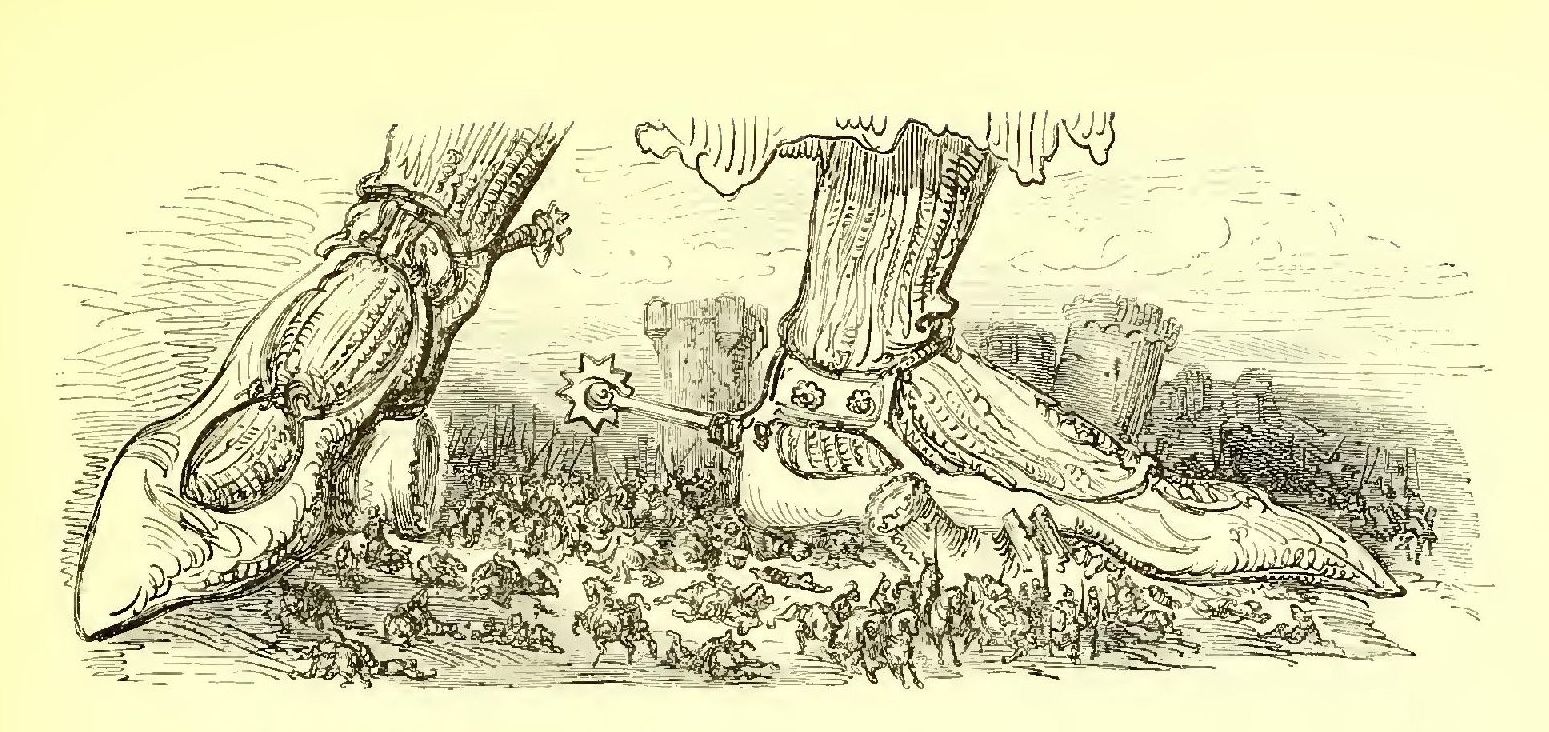 He was eight feet in height, according to the measurement of his own feet, which historians allege with fervour were of remarkable length. His eyes were large and piercing. When he was enraged you could almost have fancied they flashed fire. His face was broad and ruddy, his hair brown, and he wore a beard that was innocent of the barber’s shears. Although he measured eight feet round the middle, his figure was wellproportioned. He devoured with ease at one repast a quarter of mutton, or a goose, or a ham, or a peacock. He was moderate in the matter of wine, which he used to take with water. His strength was so enormous that it was mere child’s play to him to straighten with his naked hands three horse-shoes at a time. He could lift at arm’s length, on the palm of his hand, a knight in full armour; and lie could cleave in twain, with one blow of his sword, a horseman in panoply of war—aye, and his horse into the bargain. This was mere sport to him, and often, with a charming complaisance which was peculiarly his own, he would take pleasure in thus giving those about him an ocular demonstration of his superhuman strength.