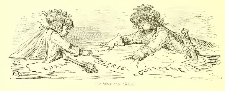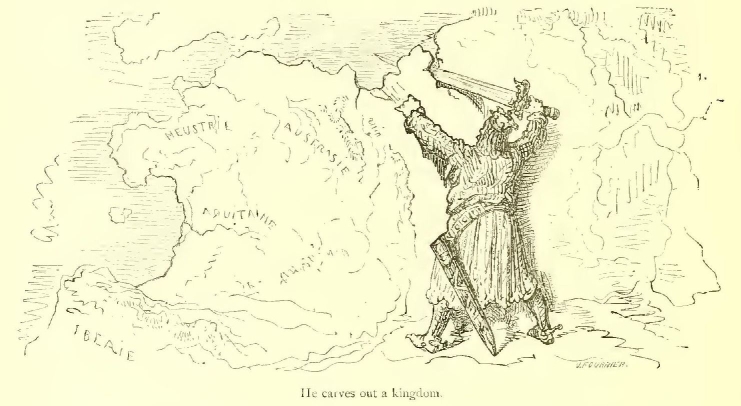 After the death of Pepin the Short, in 768, his two sons, Carloman and Charlemagne, divided his kingdom. Carloman, who was the elder, took Burgundy, Provence, Septimania, and the chief part of Neustria. His coronation took place on the 9th October, 768, at Laon. Charlemagne had part of Neustria, Bavaria, and Thuringia. He was crowned at Soissons on the same day as Carloman. Aquitaine was also shared between the brothers. You are probably aware that Pepin the Short was the founder of the second line of French kings. The first line, that of the Merovingians, was not, however, extinct when he came to the throne, for the Dukes of Aquitaine were of Merovingian descent. They sprang from Caribert, King of Toulouse, the son of Clotaire the Second. Eudes, who shares with Charles Martel the glory of having conquered the Saracens in the sanguinary battle of Poitiers, in 732, was also of this family.