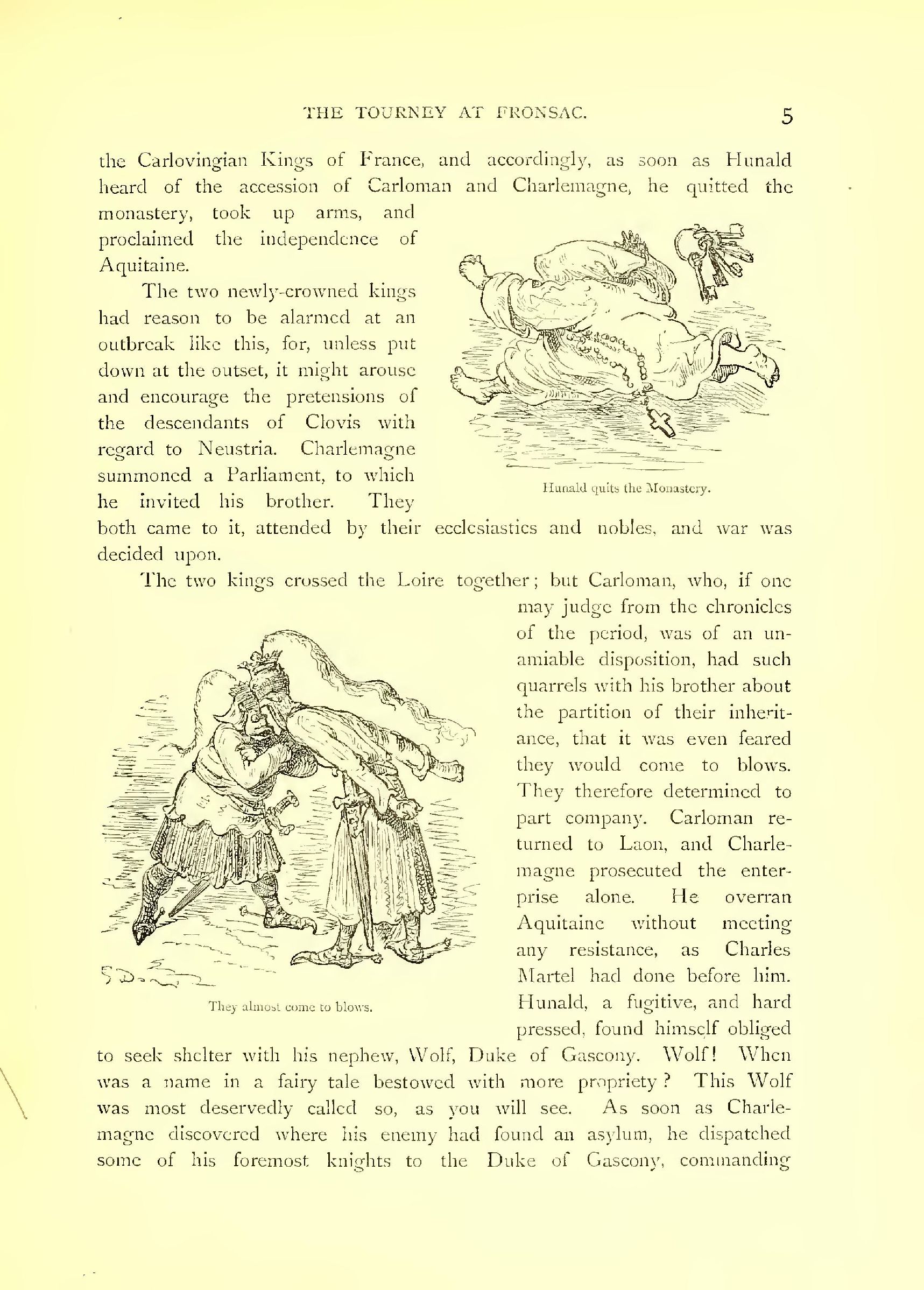 The two kings crossed the Loire together; but Carloman, who, if one may judge from the chronicles of the period, was of an un-amiable disposition, had such quarrels with his brother about the partition of their inheritance, that it was even feared they would come to blows. They therefore determined to part company. Carloman returned to Laon, and Charlemagne prosecuted the enterprise alone. He overran Aquitaine without meeting any resistance, as Charles Martel had done before him. Hunald, a fugitive, and hard pressed, found himself obliged to seek shelter with his nephew Wolf, Duke of Gascony. Wolf! When was a name in a fairy tale bestowed with more propriety? This Wolf was most deservedly called so, as you will see. As soon as Charlemagne discovered where his enemy had found an asylum, he dispatched some of his foremost knights to the Duke of Gascony, commanding him to deliver up the fugitive, and threatening, if he refused, to enter his duchy and lay it waste.