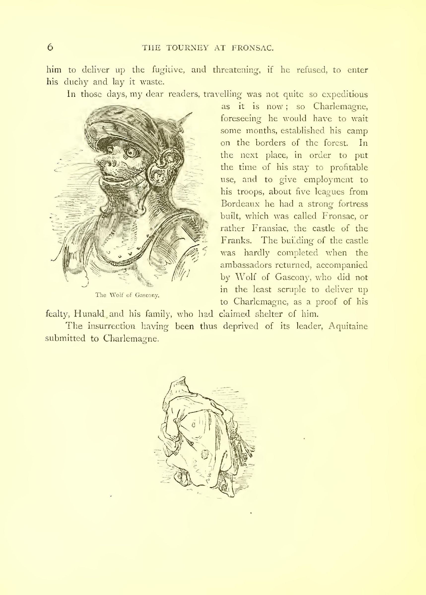 In those days, my dear readers, travelling was not quite so expeditious as it ‘s now! so Charlemagne, foreseeing he would have to wait some months, established his camp on the borders of the forest. In the next place, in order to put the time of his stay to profitable use, and to give employment to his troops, about five leagues from Bordeaux he had a strong fortress which was called Fronsac, or rather Fransiac, the castle of the Franks. The building of the castle was hardly completed when the by Wolf of Gascony, who did not in the least scruple to deliver up to Charlemagne, as a proof of his fealty, Hunald and his family, who had claimed shelter of him.