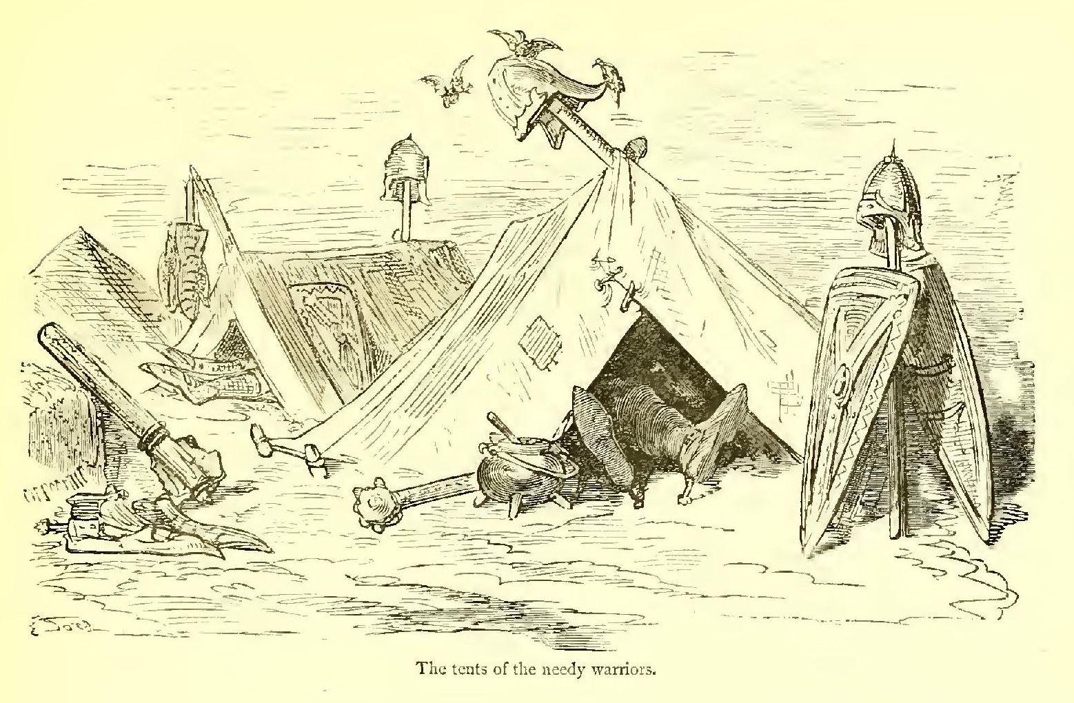 On a level space not far from the northern gate were raised twelve gorgeous pavilions, reserved for the twelve principal French champions who held the lists. Pennons with their colours, and those of their lady-loves, fluttering in the wind, waved in the sunlight like flying serpents. Each knight had his shield suspended before his tent, under the charge of a squire.
