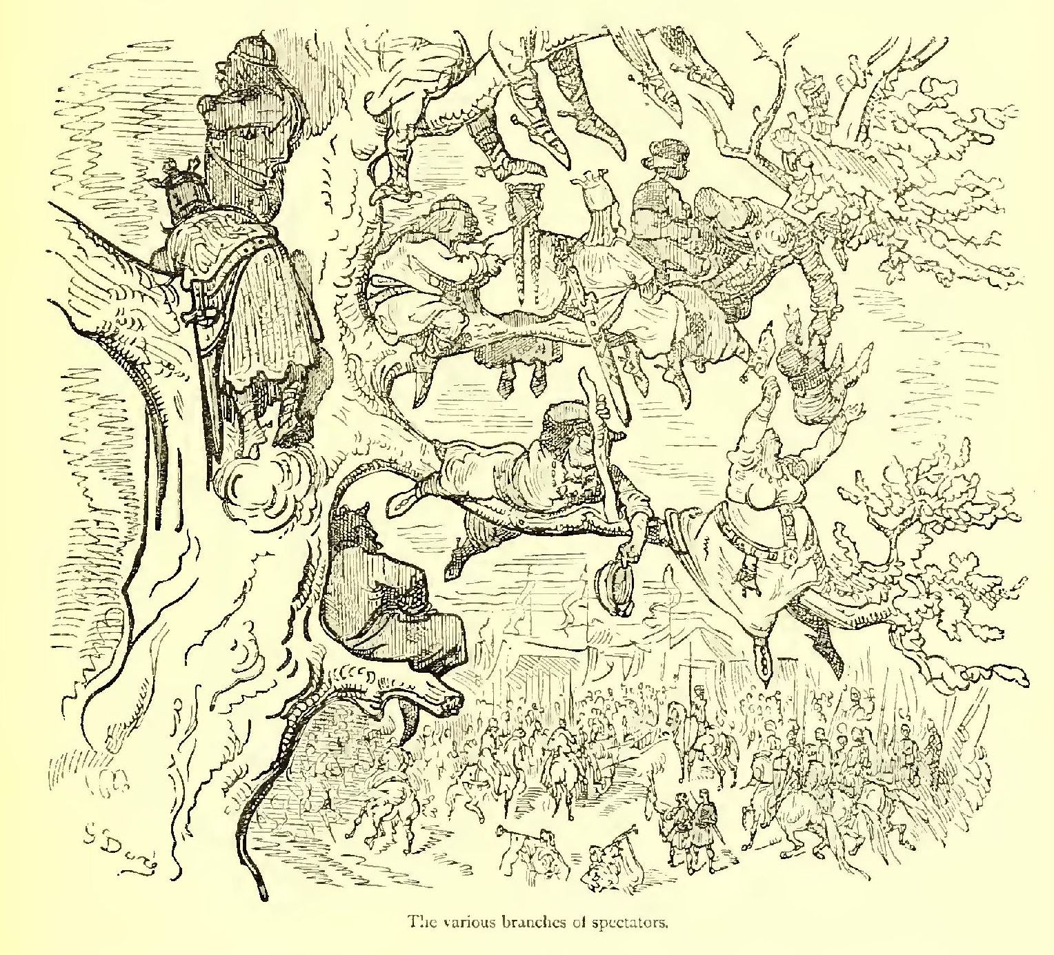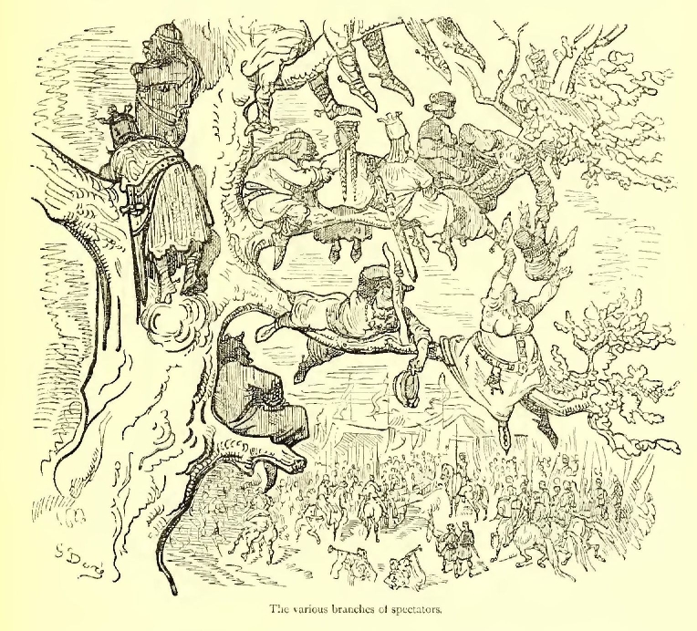 At length the day of the tournament arrived. There had been many jousts before, but never had there been one of equal magnificence. From the earliest dawn the places were all occupied. Even the old trees were as thickly loaded with curious spectators as a plum-tree in August; and the good folks were right to crowd so, for had they lived their lives six times over, they would never have seen anything equal to the sight again, it was absolutely necessary for the soldiers to lay about with their pike-staves, in order to calm the eager ardour of the most enthusiastic; but nobody took any notice of thumps that, under any other circumstances, would have been received with an ill grace.