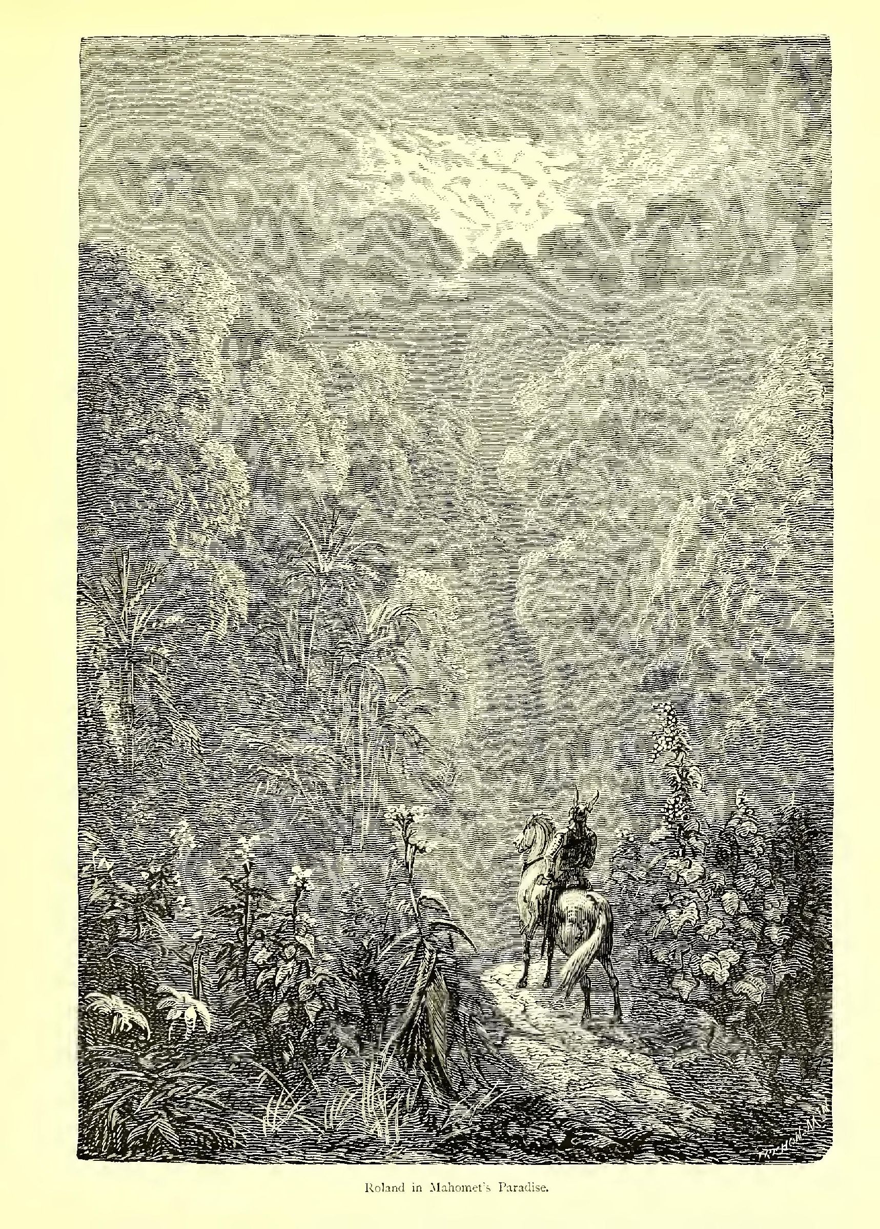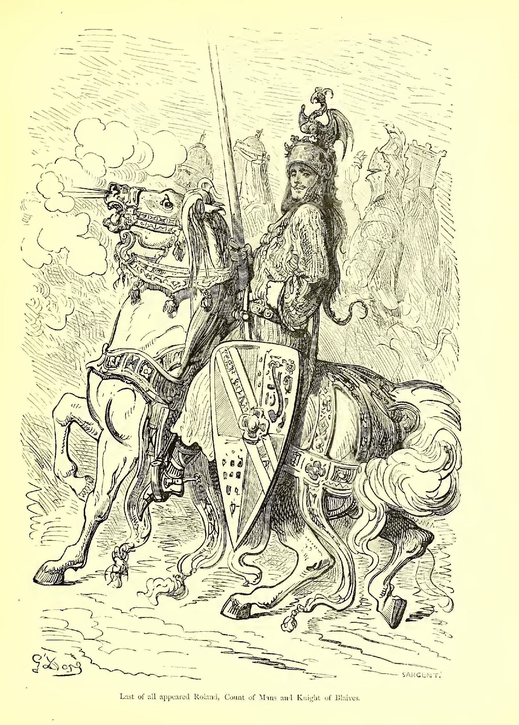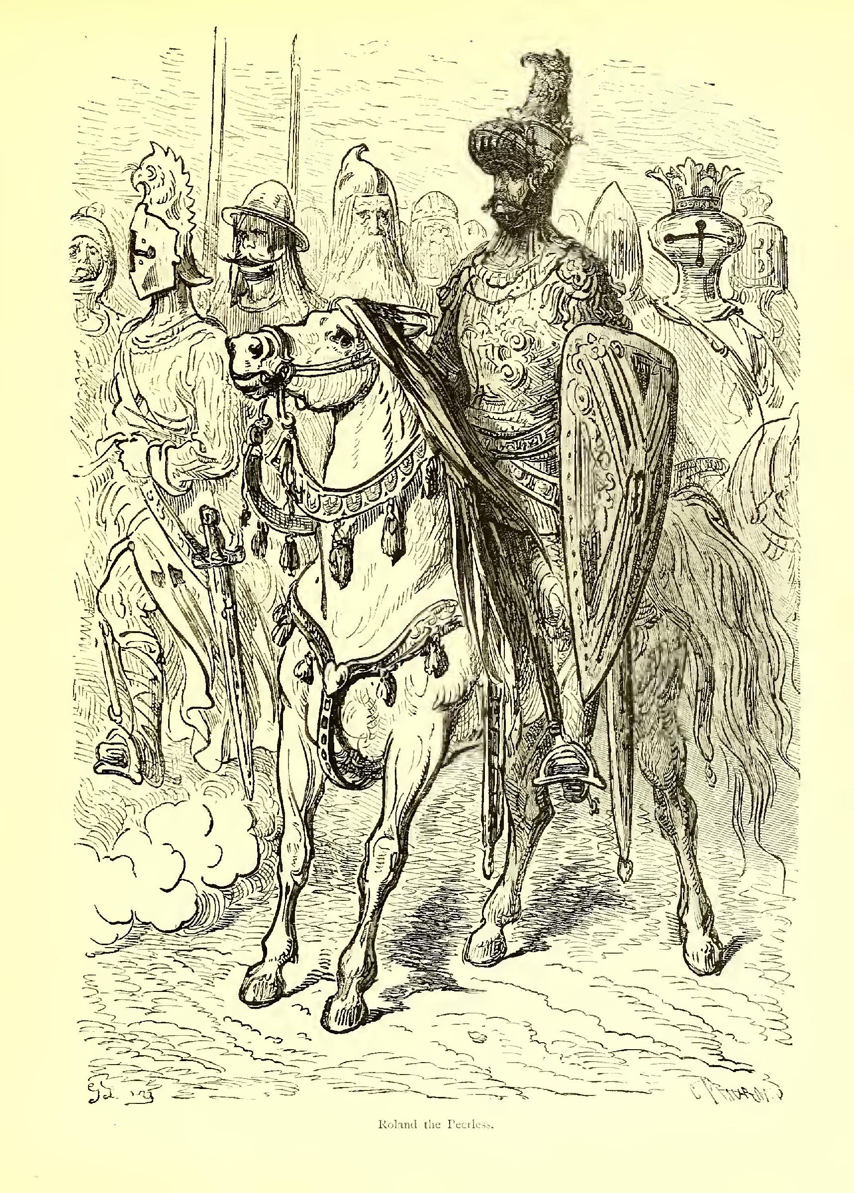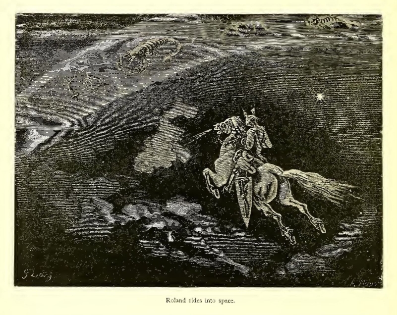 Last of all appeared Roland, Count of Mans and Knight of Blaives, son of Duke Milo of Aiglant, and of Bertha, the sister of Charlemagne. You would have taken him for a statue of iron and marble. His right hand brandished a spear that in these days would serve for the mast of a frigate; his left reposed on his faithful sword Durandal. I know of no one to whom to compare him but the Archangel Michael. His air is at once terrible and tender: should one love him or fear him? He is of such a majestic, awe-inspiring presence, that one can hardly be astonished at any wonders he performs. He appears to belong to a race that is more than human, and you would hardly be surprised were he to drag a star from its sphere or seize a comet by the beard. He is of the same height as Charlemagne, but more imposing in figure and gait. His open countenance invites confidence and inspires respect. When Roland gives a man his hand, the lucky fellow, who is thus honoured as with a royal favour, feels, in the pride of having achieved such a distinction, a greater confidence in his own worth. Roland is mounted on Veillantif, the only horse in the world worthy of such a rider.