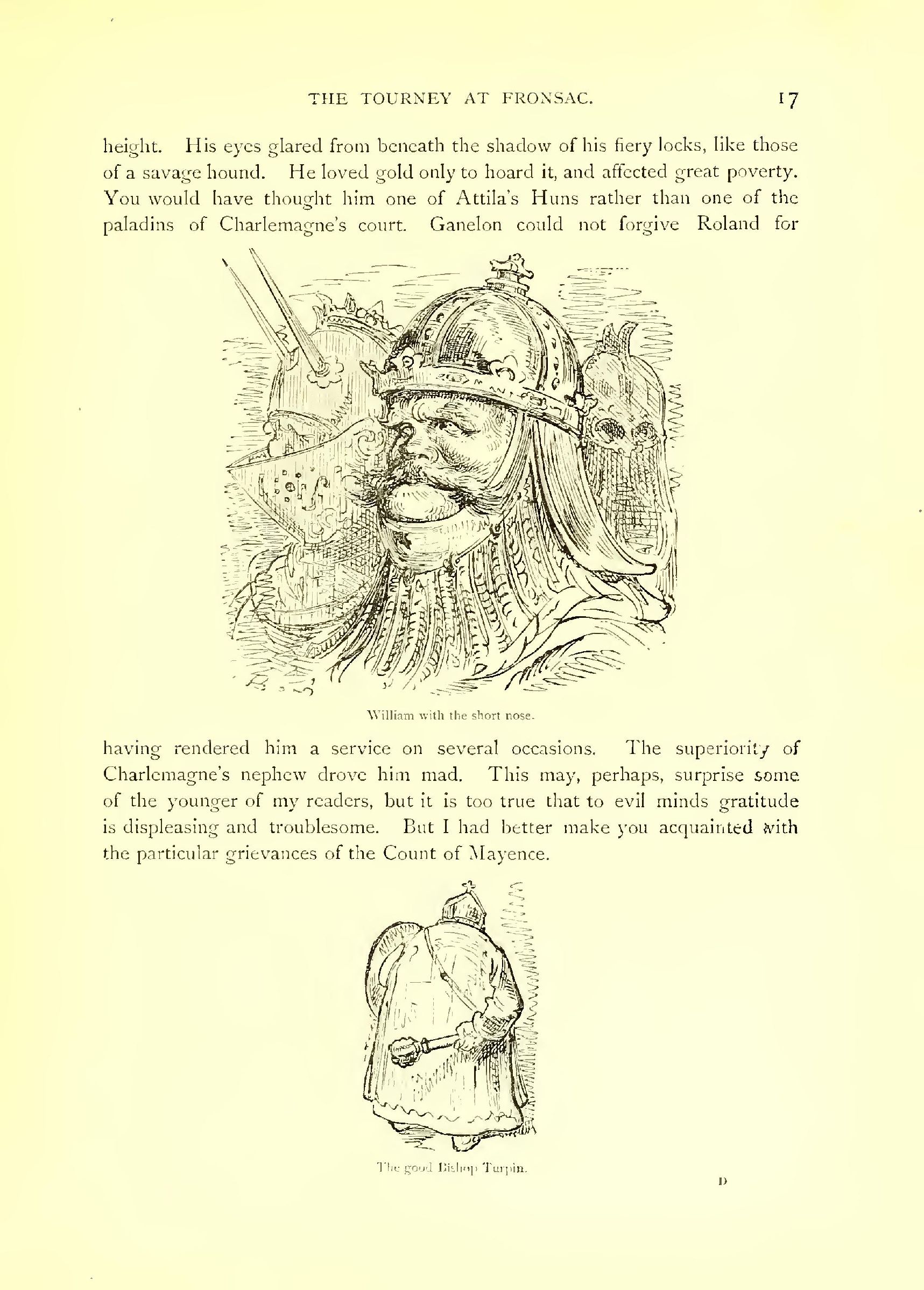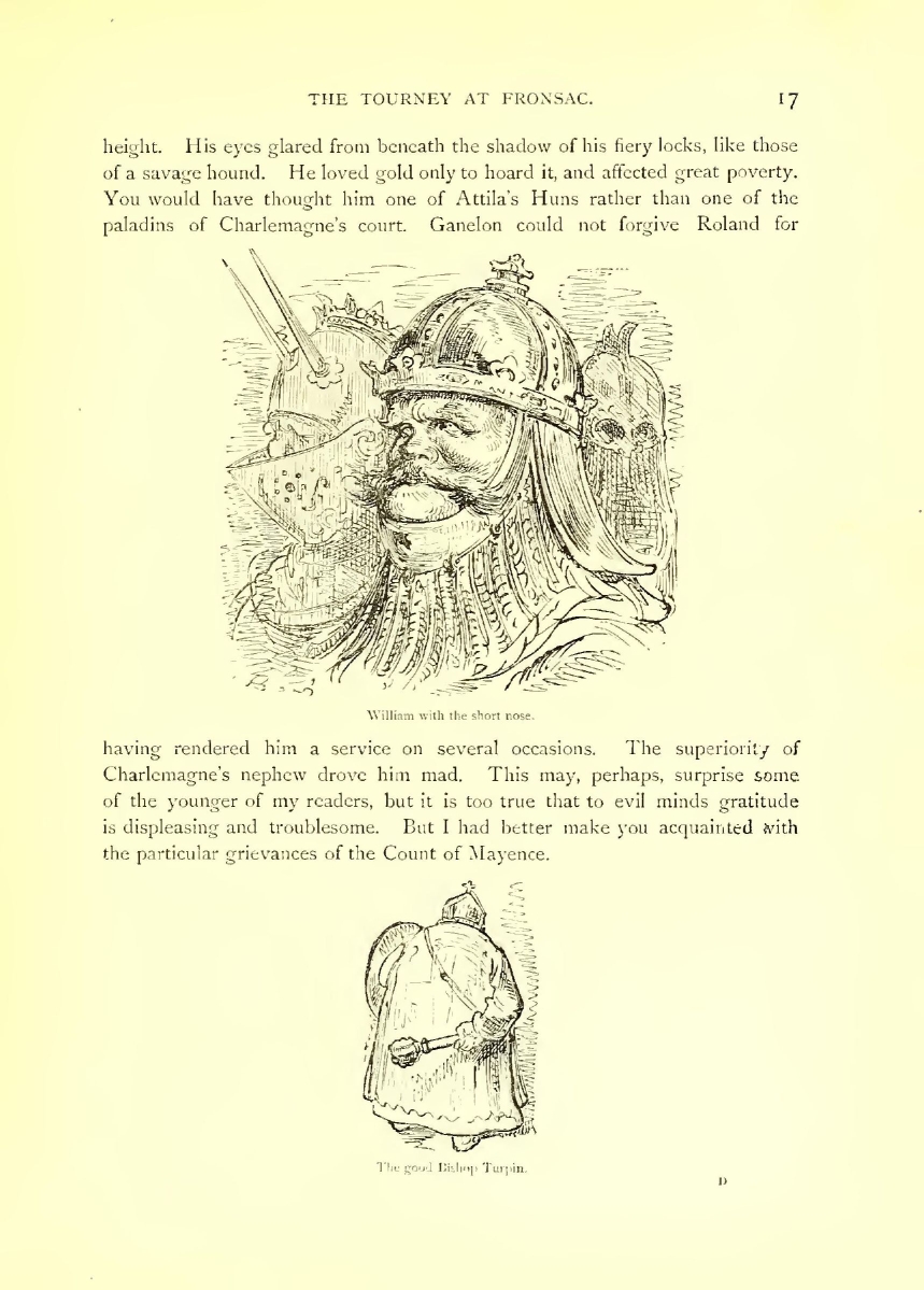 Close at hand is Oliver, Count of Genes, the brother of the beautiful Aude. He is hardly second to Roland in strength, in agility, and in appearance. At his side gleams Haute-Claire, and he is mounted on Ferrant d’Espagne, a steed that darts straight towards the foe like an arrow. Then follow Duke Oger, Richard of Normandy, Thibault of Rheims, Guy of Burgundy, Ogier the Dane, Duke Naimes of Bavaria, Girard of Montdidier, Bernard, the uncle of Charlemagne; Miton of Rennes, the friend of Roland; William of Orange, with the short nose, whose name made evil-doers tremble (as you have trembled, little people, at the name of Bogey!); besides a thousand others, not forgetting Turpin, the good Archbishop of Rheims, so learned in the council-hall, so pious in the cathedral, so brave on the field of battle. Turpin was armed in warlike fashion; his rosary and his mace hung side by side; in the handle of the latter was enclosed a precious relic, a bone of St. Clet. He could not wield a sword, for his religion forbade him to shed blood; but it is a fact that his mace weighed a hundred and fifty pounds.