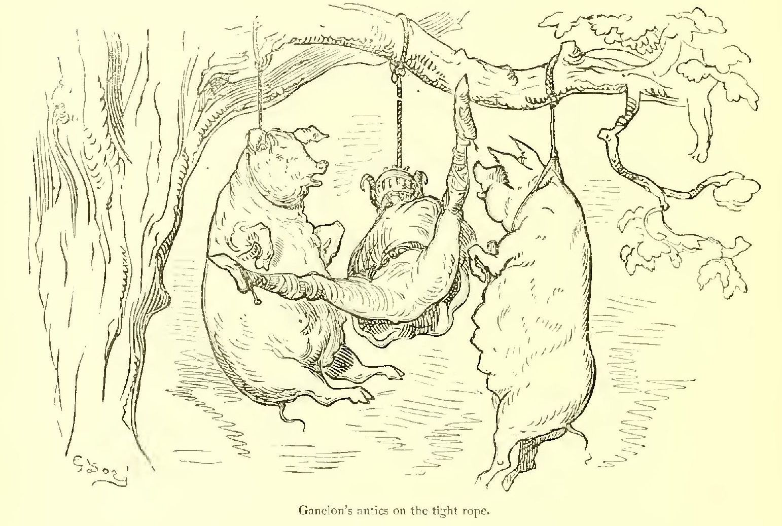 This idea appeared very agreeable to everybody except Ganelon, who uttered the most furious oaths. But they dragged him, armed as he was, under an oak, and then, having chosen a stout bough worthy of such fine fruit, they adjusted the cord round his neck. Then they brought the two slaughtered pigs—the only victims of the Count of Mayence—and having fitted each with a strong hempen cravat, suspended them one at each end of the bough, reserving the post of honour for the knight. These preparations concluded, Ganelon was dragged, bound hand and foot, to the place of execution. He writhed about in the madness of his rage, foaming at the mouth, calling on his companions in villany, and cursing them for their desertion. In vain did he struggle—a score of sturdy arms speedily hoisted him up between his two companions.
