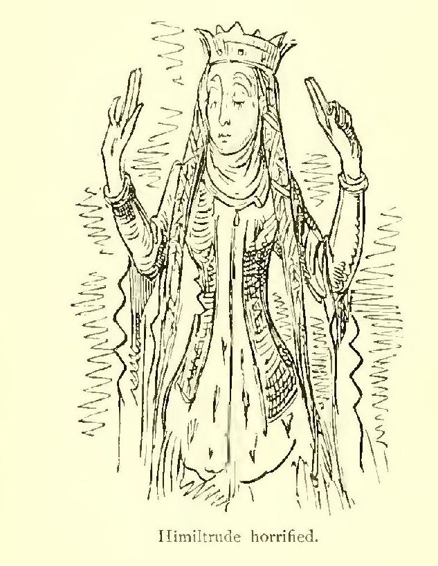 The Queen Himiltrude, a Frank by birth, advanced in the midst of her attendants. Her neck was tinged with a delicate rose, like that of a Roman matron in former ages. Her locks were bound about her temples with gold and purple bands; her robe was looped up with ruby clasps. Her coronet and her purple robes gave her an air of surpassing majesty. She was a worthy queen of Charlemagne. But if the queen surpassed all other women in nobleness of mien, Aude, the niece of Gerard of Vienne, and sister of Oliver the Brave, surpassed her as much by her beauty, her grace, and her attractiveness. She wore a light crown, embossed with jewels of all colours. Her hair was fair, falling naturally into becoming curls; her eyes were blue as the sea of the south; her complexion was pink, like the heart of a white rose; and her hands were marvellously small. As she passed Roland, she turned slightly pale. If she had been less lovely, I should have said more about her rich attire; but what is the use, since nobody notices it? The queen must have been very strong-minded, to retain so charming a lady of honour about her person. On seeing the beautiful Aude, every one said, “There, or I’ll die for it, is the Queen of Beauty!”