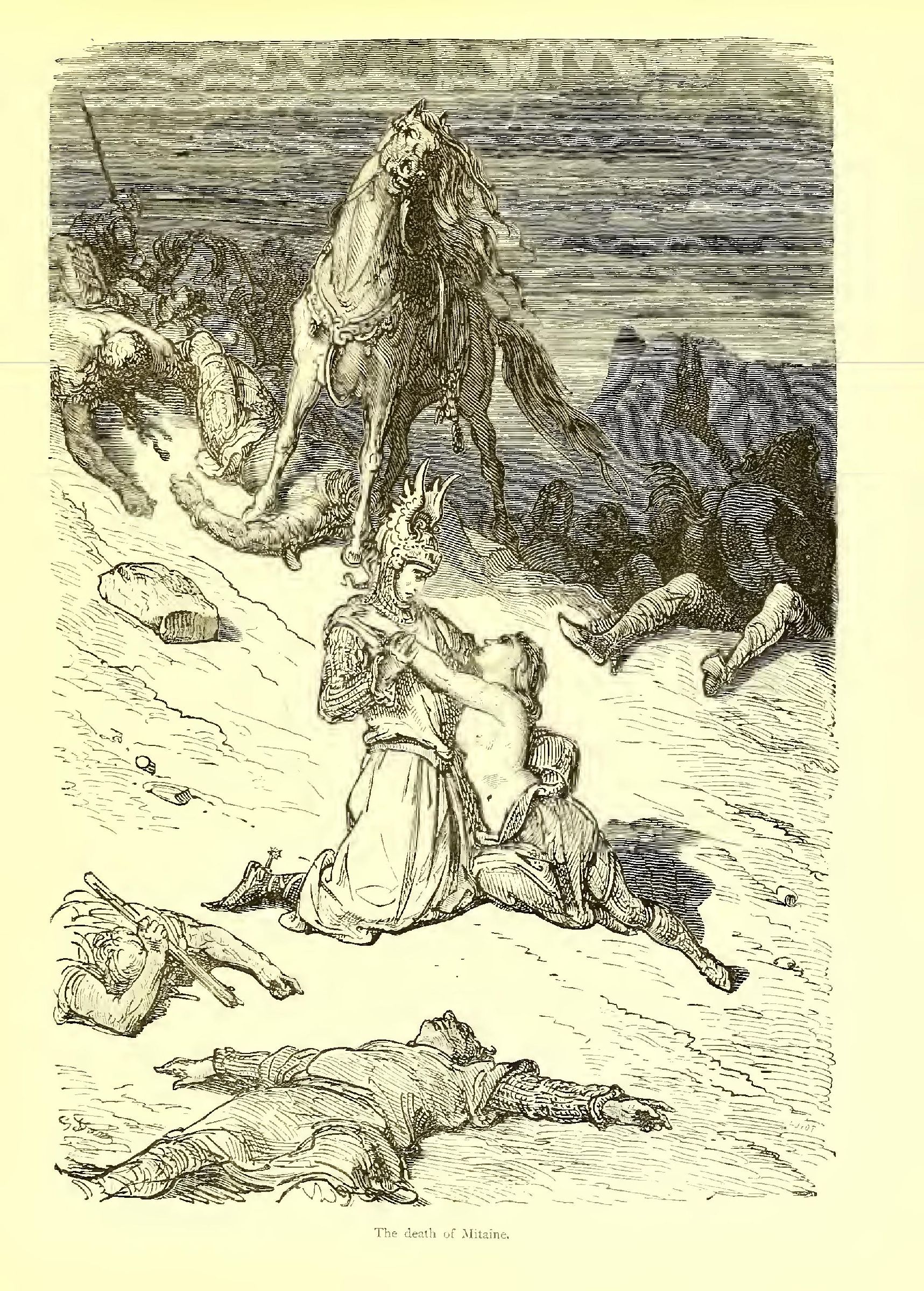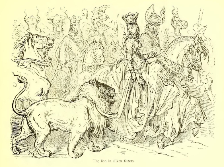 And Mitaine freed herself from his grasp, and sprang on a Saracen horse that she caught as it went riderless by. She was naked to the waist, and her golden hair floated around her shoulders. She seemed like the spirit of youth. Death fled from the presence of such lofty courage.