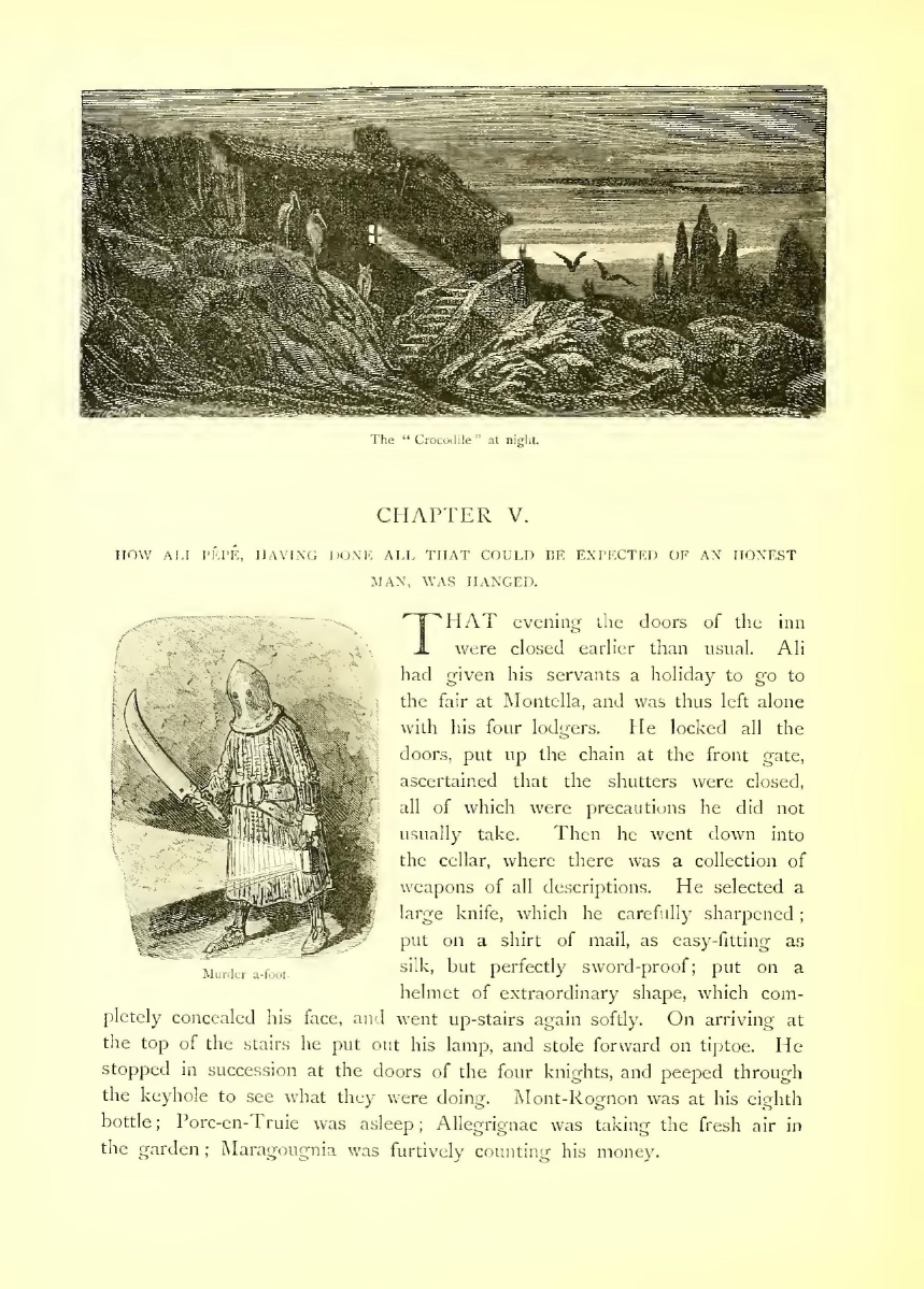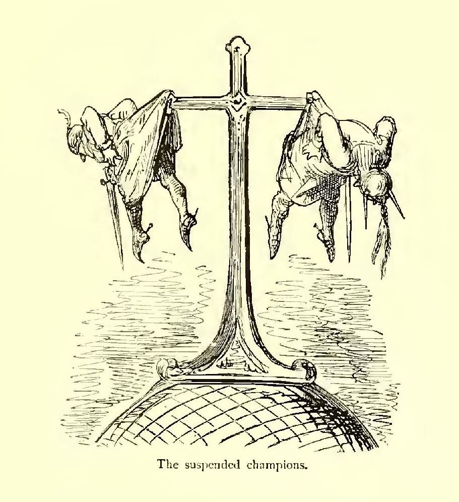 “Oho!” said Ganelon to himself, “this is quite another affair, and all is not yet lost, possibly. Only, if I continue my gambols, I may, perhaps, give the hint to these idiots, and they might hang me again more carefully. I’ll sham dead, and it’s odd if the Evil One doesn’t send some one to my aid. It would be very inconsiderate of him to let me die like this!”