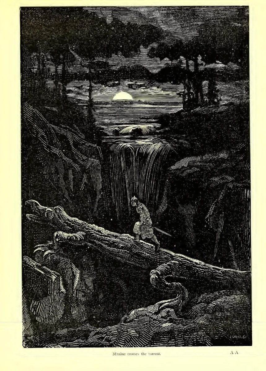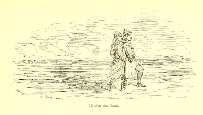 Mitaine had caught sight of the King of Saragossa, and made direct for him, without looking right or left. Miton, whose headlong courage had carried him into the ranks of the foe, was beside her, surrounded by the Saracens. He was striking out right and left at random, thinking only to hack and hew the bodies of Pagans. Alas for the double misfortune! Mitaine drew near him and her father’s sword traced a gory slash across her shoulder. She turned, and father and child recognised each other.