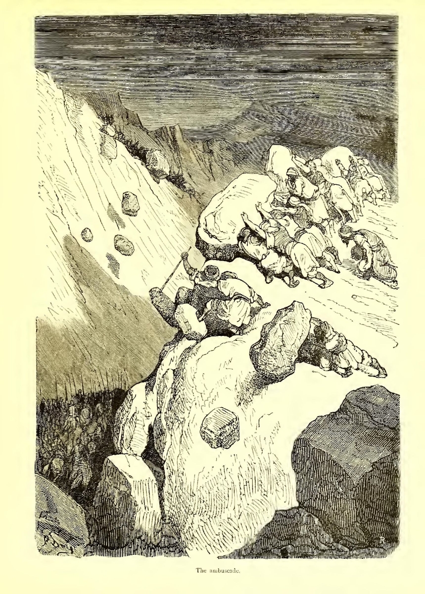 Ganelon and his rascals placed themselves in ambush along the border of the forest, and before long saw a thick cloud of dust rising along the road in the distance.