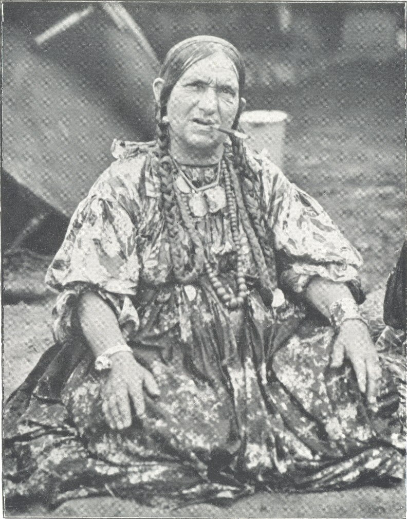 During the next few days occasional questions showed that my guests had carried news of the picture to the camp, and that the tribe hid beneath their affected indifference some curiosity as to how it came to be in my possession. But I was totally unprepared for the demonstration of deep concern which the paltry print was to wring from the great Kola’s dignified wife. Taking me quietly aside she p. 35invited me to sit near her, told me that she had heard about the photograph, and expressed a desire to see it. I gladly seized the opportunity to give her a cordial invitation to come with her husband to tea. Without such an excuse I should not have dared to suggest a visit; for, absurd as it may seem to those who do not know these people, I felt instinctively that the chief and his lady were personages of rank so high that it would have been presumptuous to ask them to my poor house. My instinct was probably just, for Tinka refused politely, alleging as excuse the weakness of her chest. Unwilling to renounce the honour of entertaining royalty, I offered to take her and the chief by rail to Liverpool and thence to Alfred Street in a taxicab; and, when this proposal was rejected, to bring the taxicab to the camp, cross the river on the luggage-boat, and take them all the way without change. But Tinka was adamant and demanded that the book should be brought to the tents. The idea of subjecting my treasured album to the eager unwashed hands of working coppersmiths did not commend itself to me, and I replied that the book was too large and p. 36too heavy to bring. “Tear the page out” she ordered, royally regardless; but I refused to mutilate the volume. Then she begged, the queenly Tinka, begged just as Lotka had begged for my carpet—earnestly, eloquently, passionately, almost irresistibly. Hardening my heart to withstand this more than usually distressing exhibition of skill in the ancient Gypsy accomplishment, I turned to look at my tormentor—she was weeping bitterly! Instead of a typical case of adroit Gypsy imposture I had found an equally typical case of Gypsy family affection. With a voice broken by sobs she offered in exchange for a brief glance at the picture, first a silver plate a foot in diameter, and then a great gold ring such as she herself wore. For among those whose portraits appeared on the card was her brother, and she had not seen him for twenty years.