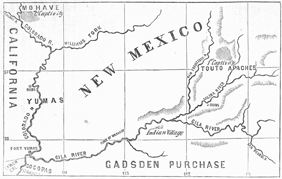 During the year 1851 news reached California, that in the spring of that year a family by the name of Oatman, while endeavoring to reach California by the old Santa Fe route, had met with a most melancholy and terrible fate, about seventy miles from Fort Yuma. That while struggling with every difficulty imaginable, such as jaded teams, exhaustion of their stores of provisions, in a hostile and barren region, alone and unattended, they were brutally set upon by a horde of Apache savages; that seven of the nine persons composing their family were murdered, and that two of the smaller girls were taken into captivity.