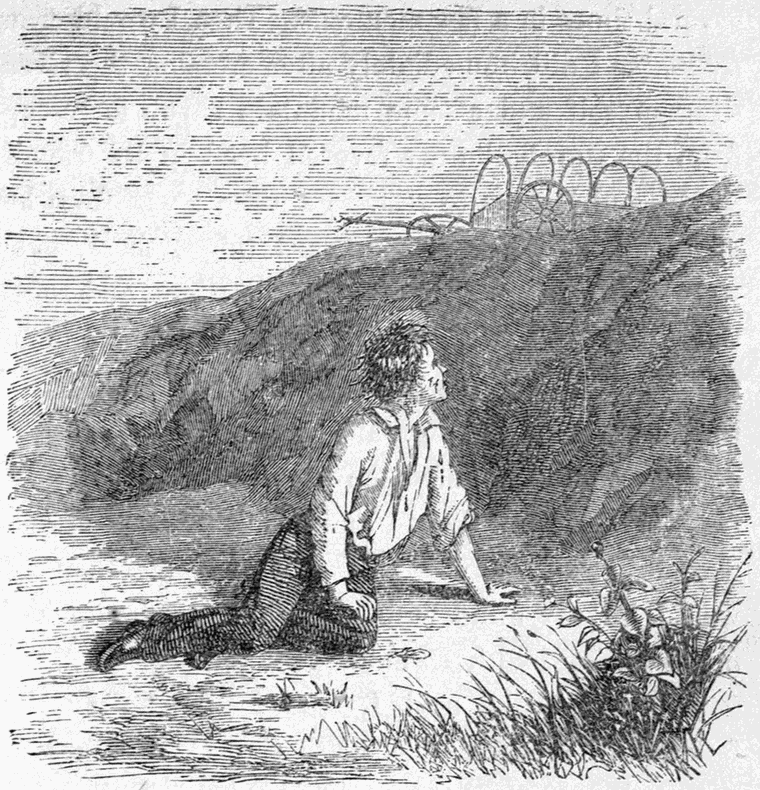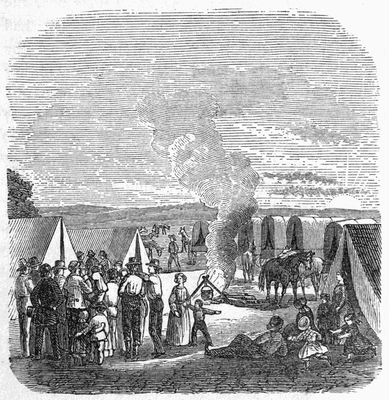 The 9th of August, 1850, was a lovely day. The sun had looked upon the beautiful plains surrounding Independence, Missouri, with a full, unclouded face, for thirteen hours of that day; when, standing about four miles south of westward from the throbbing city of Independence, alive with the influx and efflux of emigrant men and women, the reader, could he have occupied that stand, might have seen, about one half hour before sunset, an emigrant train slowly[22] approaching him from the city. This train consisted of about twenty wagons, a band of emigrant cattle, and about fifty souls, men, women, and children. Attended by the music of lowing cattle, and the chatter of happy children, it was slowly traversing a few miles, at this late hour of the day, to seek a place of sufficient seclusion to enable them to hold the first and preparatory night’s camp away from the bustle and confusion of the town.