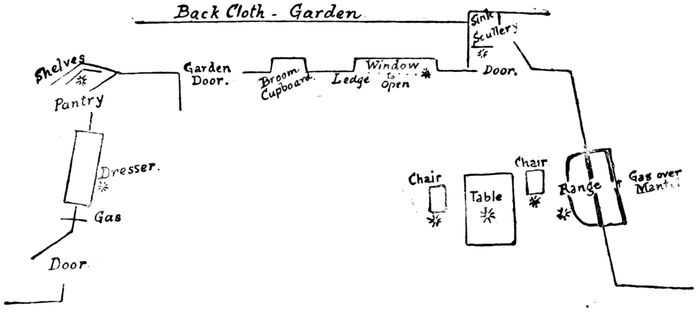 | Kettle on Stove. | Cake in Tin in Oven down Stage. |