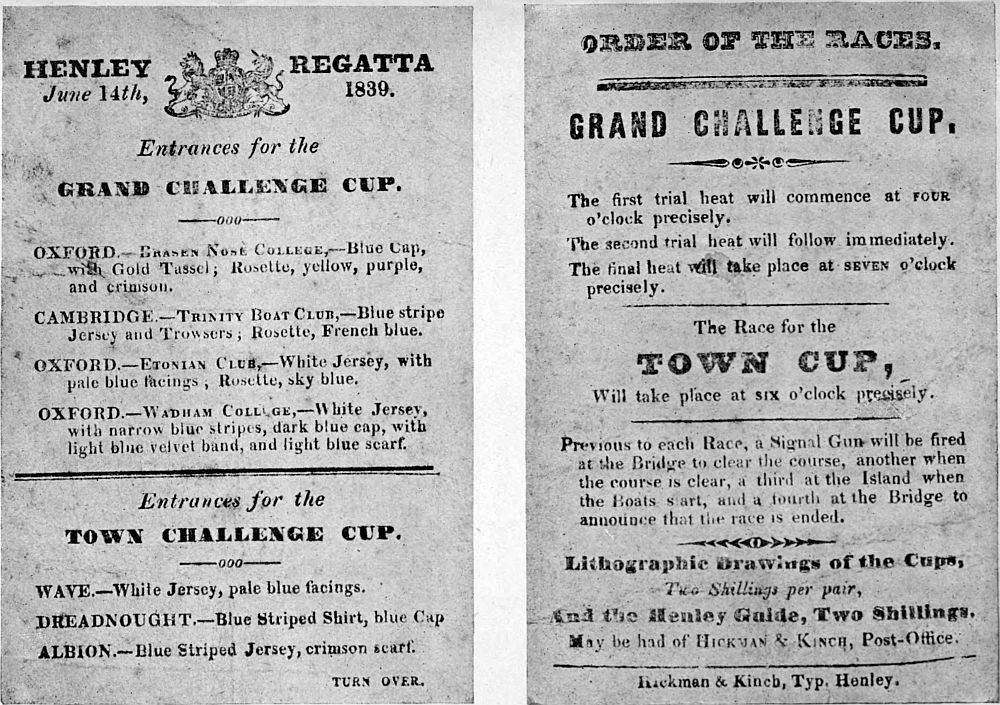 Of the early history of boats and boat-racing it is not necessary to say very much. It is enough to know that the written Cambridge records date back to 1827, though it is certain that racing must have begun some years previously; that Oxford can point to 1822 as one of the earliest years of their College races; that the two Universities raced against one another for the first time in 1829; and that Henley Regatta was established[Pg 6] in 1839, when the Grand Challenge Cup was won by First Trinity, Cambridge. Opposite is a facsimile copy of the programme of this memorable regatta.