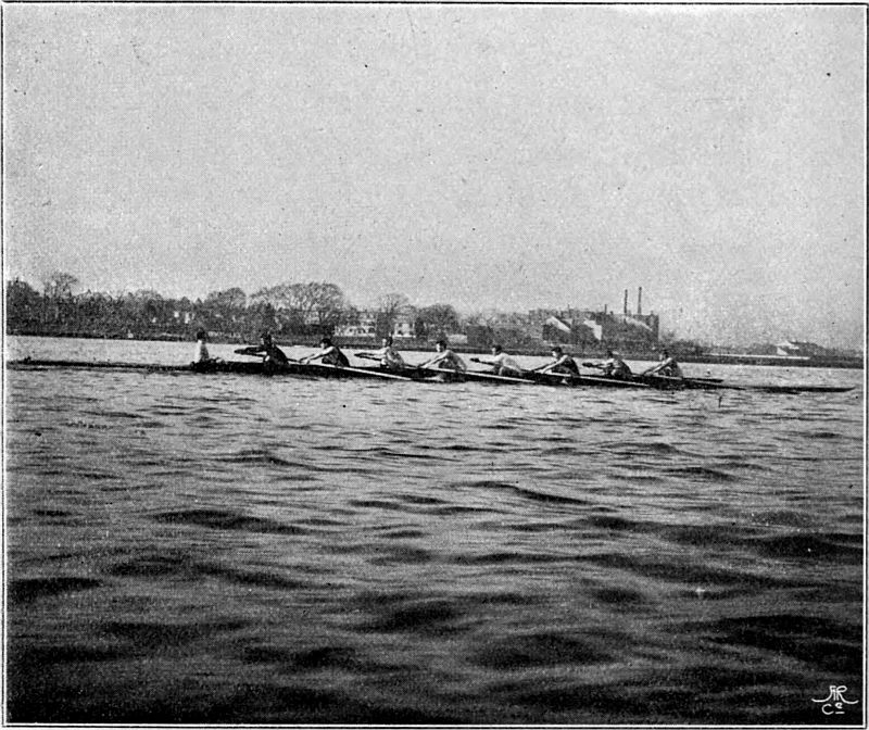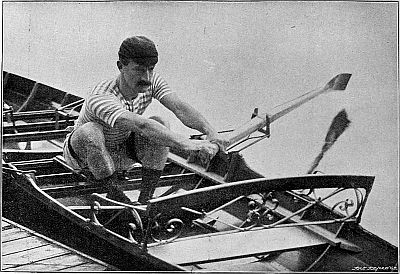 So much for the trireme. But neither the Greeks nor any other race thought of adapting their boats merely to purposes of racing until the English, with their inveterate passion for open-air exercise, took the matter in hand. African war-canoes have been known to race, but their primary object is still the destruction of rival canoes together with their dusky freight. In Venice the gondoliers are matched annually against one another, but both the gondola and the sandolo remain what they always have been—mere vessels for the conveyance of passengers and goods. The man who would make war in a racing ship would justly be relegated to Hanwell, and to carry passengers, or even one "passenger," in such a boat is generally looked upon as a certain presage[Pg 10] of defeat. Consider for a moment. The modern racing ship (eight, four, pair, or single) is a frail, elongated, graceful piece of cabinet work, held together by thin stays, small bolts, and copper nails, and separating you from the water in which it floats by an eighth of an inch of Mexican cedar. The whole weight of the sculling-boat, built by Jack Clasper, in which Harding won the Searle Memorial Cup, was only nineteen pounds, i.e. about 112 pounds lighter than the man it carried. Considering the amount of labour and trained skill that go towards the construction of these beautiful machines, the price cannot be said to be heavy. Most builders will turn you out a sculling-boat for from £12 to £15, a pair for about £20, a four for £33, and an eight for £55. But the development of the racing type to its present perfection has taken many years. Little did the undergraduates who, in 1829, drove their ponderous man-of-war's galleys from Hambledon Lock to Henley Bridge, while the stricken hills of the Thames Valley rebounded to the shouts of the spectators—little did they imagine that their successors, rowing on movable seats and with rowlocks projecting far beyond the side[Pg 11] would speed in delicate barques, of arrowy shape and almost arrowy swiftness, from Putney to Mortlake—in barques so light and "crank" that, built as they are without a keel, they would overturn in a moment if the balance of the oars were removed. The improvements were very gradual. In 1846 the University race was rowed for the first time in boats with outriggers. That innovation had, however, been creeping in for some years before that. Mr. Hugh Hammersley, who rowed in the Oriel boat which started head of the river at Oxford in 1843, has told me that in that year the University College boat, stroked by the famous Fletcher Menzies, was fitted with outriggers at stroke and bow; and the bump by which University displaced Oriel was generally ascribed to the new invention.