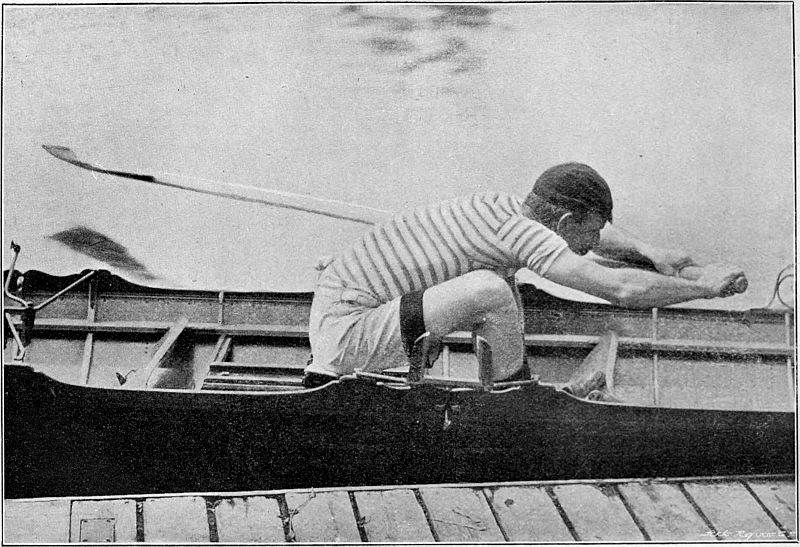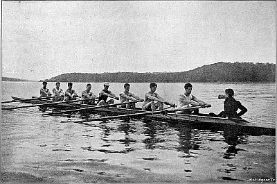 One might have thought that with this invention improvements would have ceased. But in course of time the practical experience of rowing men suggested to them that if they slid on their seats, both the length and power of their stroke through the water would be increased. At first they greased their fixed seats, and slid on those. But it was found that the strain caused by this method exhausted a crew. In 1871 a crew of professionals used a seat that slid on the thwarts, and beat a crew that was generally held to be superior, and from that moment slides, as we now know them, came into general use. In 1873 the University[Pg 13] crews rowed on sliding seats for the first time. Since then the length of the slide has been increased from about nine inches to fifteen inches, or even more, a change which has made the task of the boat-builder in providing floating capacity more difficult; but in all essentials the type of boat remains the same. It ought to be added that the Americans, to a large extent, use boats moulded out of papier maché, but this variation has never obtained favour in England, though boats built in this manner by the well-known Waters of Troy (U.S.A.) have been seen on English rivers. The Columbia College crew won the Visitors' Cup at Henley in 1878 in a paper boat, and she was afterwards bought by First Trinity, Cambridge, but she never won a race again.