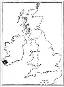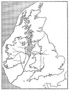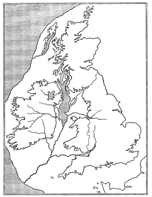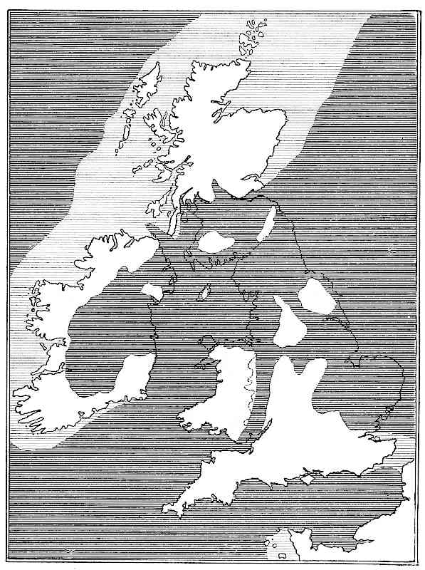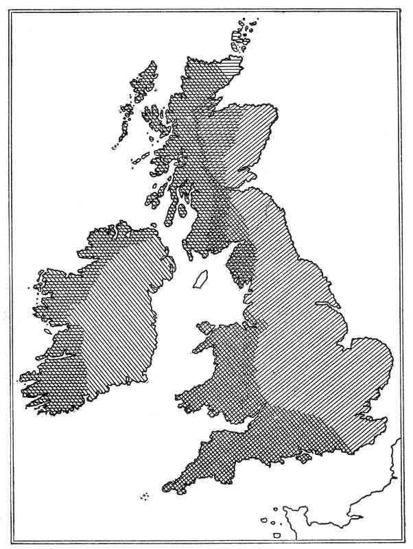 Fig. 1.—Map of the British Islands, indicating approximately the areas inhabited by the northern, southern, and eastern animals. The horizontal lines represent the areas of northern species, the sloping lines those of southern and eastern ones.