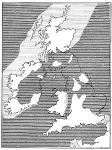 The problem of tracing the origin of the British fauna, or at least that of some of the more characteristic members of every section or element,[Pg 6] appears at first a somewhat difficult task. Indeed, the means of dispersal of the various groups of animals are so different that it occurred to me it might be better to deal with the mammals, the birds, the reptiles, and so forth, all separately. This idea I have attempted to follow to some extent, with most satisfactory results. The British fauna of the present day is no doubt complex, but no more so than the fauna of the most recent of our geological deposits—the Pleistocene. However, when we go back still further and look at the earlier Tertiary remains, we find the fauna becoming less complex. Northern species disappear, and the strata are entirely filled with the remains of southern animals and plants. Geologists indeed are quite unanimous in their belief, that the fauna of the British Islands during the earlier epochs of the Tertiary Era was a southern one; that it then gradually became more temperate, until at last, in more recent times, decidedly northern forms invaded the country. These seem to have driven out—to some extent at least—the southern species; but more recently again, the southerners, reinforced by an eastern contingent, appear to have gained territory and are advancing into the area held by the northerners. The eastern invasion does not seem to have affected Ireland at all, and we find the country there divided between the southern and northern animals. We can thus roughly construct a map as I have done here, showing, by means of horizontal and sloping lines, the principal[Pg 7] areas inhabited at the present time by the species of northern, southern, and eastern origin (Fig. 1).