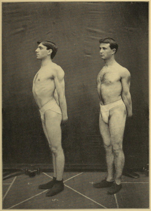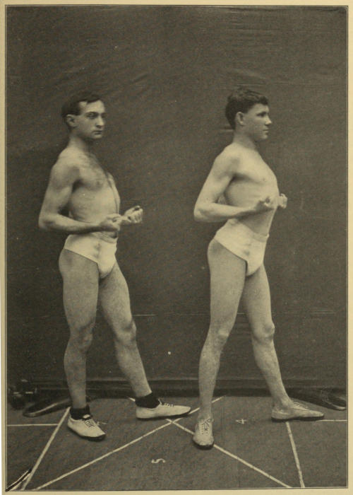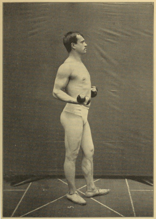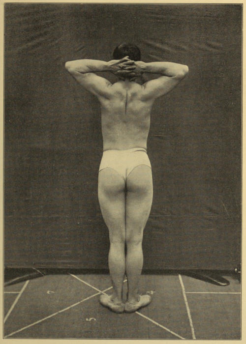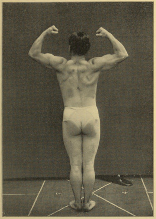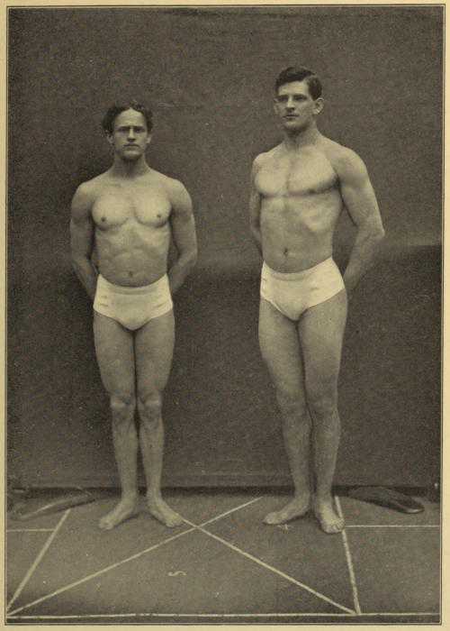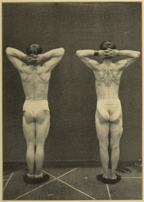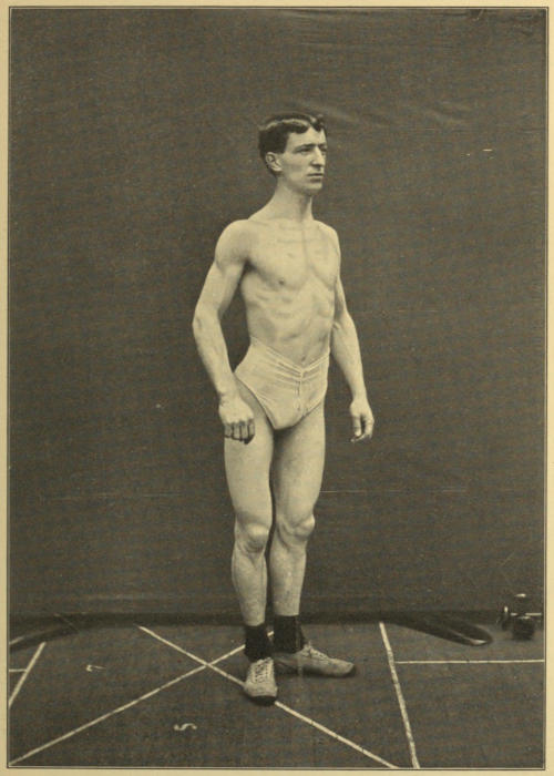 The photographs of W. L. Anderson and Bellis, facing pages 440 and 442, show, on the other hand, two athletes whose characteristic build is indicative of ability as gymnasts. More graceful in form, with smaller joints, and less heavy musculature, these men, at the time the photographs were taken, were in the pink of condition, and in a high degree of training for their special fields of athletic work. Emphasis should be laid upon the fact that at the time these two photographs were taken, the men in question had not commenced to lower their daily amount of proteid food. These two photographs are introduced especially to illustrate the general physical makeup of the men belonging to the group of University athletes made use of in the experiments.