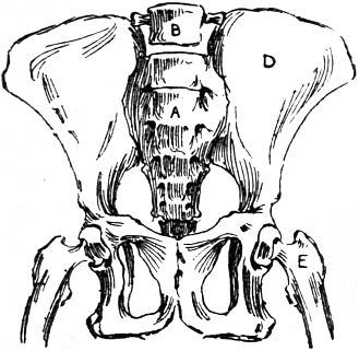 Near the base of the spinal column is a certain bone called the sacrum. It is a constituent part of the column, but in its singular form and structure somewhat differs from the corresponding bone in man. The general outline of this bone in the plane of the hips is that of an isosceles triangle. It fits in between the two large bones that spread5 out towards the hips, and articulate with the thighbones.