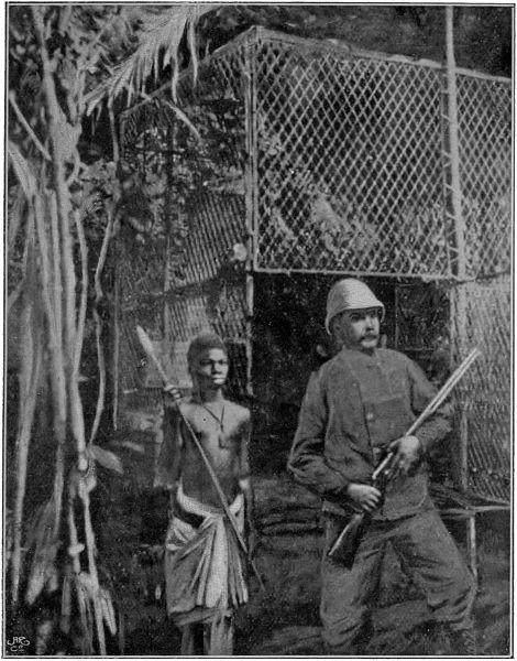 While I sat in my cage watching Othello, who lay on the ground a short distance away, I discovered a native approaching him from the jungle. The man had an uplifted spear in his hand, as if in the act of hurling it at something. He had not seen me, but it did not for the moment occur to me that he had designs upon my pet. I spoke to him in the native language, when he explained that he had seen the young gorilla, and from that fact suspected there was an old one close at hand, for whose attack he was prepared: that he was not afraid of the little one, but desired to capture it. I informed him that my gorilla was ill. He examined it, and assured me that it would die. The man departed, and Othello continued to grow worse. His sighing and groaning were really touching. I gave him an emetic, which took effect with good results. I also used some vaperoles to resuscitate him, but my skill was not sufficient to meet the demands of his case.