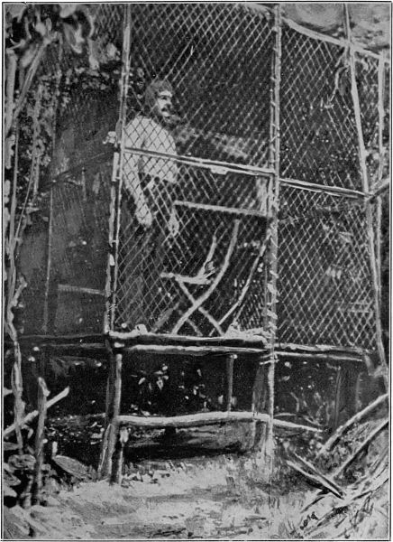 Another interesting specimen that I saw came prowling through the jungle as if he had lost his way. He found a small opening, or tunnel, which I had cut through the foliage in order to get a better view. Turning into that, he came a few242 steps towards the cage before he discovered it. Suddenly he stopped, squatted on the ground, but did not sit flat down. For a few seconds he was motionless, and so was I. He slowly raised one arm till his hand was above his head, in which position he sat for a few seconds, when he moved his hand quickly forward as if to motion at me. He did not drop his hand to the ground, but held it at an angle from his face for a short time, then slowly let it down till it reached the ground. During this time he kept his eyes fixed on me. At length he raised the other arm and seized hold of a strong bush, by which he slowly drew himself in a half-standing position. Thus he stood for a few seconds, with one hand resting on the ground. Suddenly he turned to one side, parted the bushes, and instantly disappeared. He uttered no sound whatever.