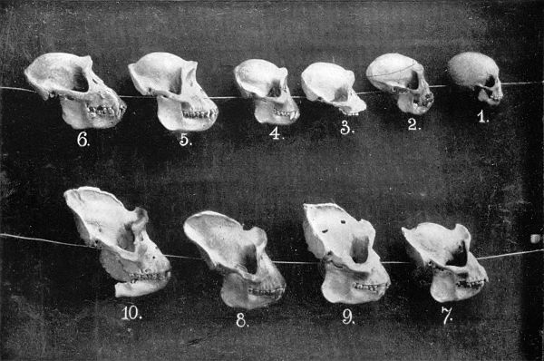 In the cranial types, it is readily seen that the skull of man is nearly round and the face is vertical, while the skull of the ape is elongated and the face receding. These facts deserve more notice than the mere mention of their being so.