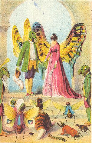 “Peace, little goose,” replied the Butterfly, tapping the Cricket on the nose with her fan, and hastening towards the Grasshopper, who was still enthralled and convulsed by the bloated old Spider.