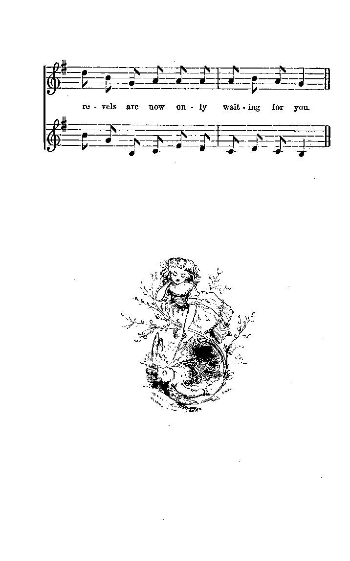 their feathers, and put out their feelers. Oh how they did dance! reels were nothing to it. The greatest difficulty was to keep the Grasshoppers in order. They became so excited that they sprang quite out of sight every moment, and so lost their partners, and ran against everybody in searching for them. Then the Bull-frog, who sang bass, got a little too much of the dew, and sang so loudly, that he quite drowned all the other players. So Mrs Butterfly put her claws in her ears, and running up to him, said, “Oh! dear Mr Bull-frog, pray do not sing quite so loudly.” The poor Bull-frog was almost weeping with joy at the merry scene before him, but he blushed very green on hearing this, and said he had forgotten what he was doing, but would try to be more careful. However, in five minutes more he was worse than ever, so they sent a few hundred bees to sing treble beside him, and try to keep him in order. In the middle of all this there was a sudden stop, and a Snail, stepping forward, offered to dance a minuet. This was received with such a roar of laughter that the poor snail, half frightened, half angry, drew in his horns and went to bed on the spot, and the dance was begun anew. By this time the Gnats and Midges, and some of the other flies, had left the ground and retired to enjoy a cool dance in the air. Two or three Spiders mounted up into the oak, and fastened threads to some of the branches, by which they dropped suddenly down among the dancers, and, seizing their partners round the waist, carried them screaming in among the leaves. So the fun and the noise became louder and louder. On the ground, under the bushes, among the branches of the trees, and in the air, the dancers bounded, skipped, laughed, sang, shouted, and flew in a way that had never been seen or heard of before. The merry old Bull-frog became quite absurd. He sang and roared like a lion; took up all the young insects in his arms and hugged them; tumbled over the other musicians, and, in short, did so many wild things that they were at length obliged to tie him to a paddock-stool, where they left him to enjoy himself.