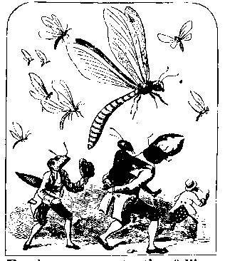 A Gnat and a Dragonfly, with a great many of their relations, arrived about the same time with the Beetle. They looked quite charming in their brilliant dresses, the colours of which were chiefly green, orange, and blue. A large Blue-bottle Fly, with a very light waistcoat, and a hat stuck on one side of his head, said that the Dragonflies were