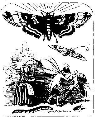 time; she saw the other insects hurrying past her house in crowds, so she threw on her clothes as fast as possible. The Moth was prettily dressed in a soft garment of down, and as she was a modest creature, every one loved her. On leaving home, she observed the Wasp and the Hornet passing. They were dressed in rich suits of brown and yellow. At sight of them she was a little frightened, and endeavoured to run back to her house until they should pass by; but they caught sight of her, and immediately gave chase, screaming out loudly, “Oh! dear Mrs Moth, pray don’t be alarmed. We have laid by our stings for to-day, and won’t hurt you.” They soon caught her, although she ran as fast as she could. So the Wasp and the Hornet each offered her an arm, and obliged her to walk between them while they danced along, shouting, and singing, and winking waggishly to the friends they passed on the road. The poor Moth blushed very much at being seen by all her friends in the company of two such wild creatures. A Caterpillar and a Long-legged Beetle, besides one or two other insects that chanced to be near, laughed very heartily on seeing what had happened. But the Moth soon recovered her spirits; and when they arrived at the oak-tree, she was walking along with a sprightly step, first talking to the Hornet and then chatting to the Wasp, as if they were her dearest friends.