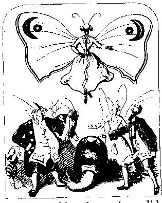 “Whom should we send, my dear!” said the Grasshopper, in reply to the Butterfly’s question; “the Fly footman, to be sure; and pray tell him to be smart about it, for I’ve been run down half-a-dozen times already by the dancers since the sun set. One lamp is too little for our ball-room. That blind Mole has run—ha! there he comes again. Look out!”