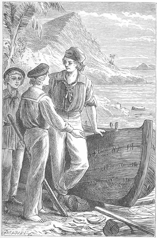 “Do you know what conclusion I have come to?” said Peterkin. “I have made up my mind that it’s capital,—first rate,—the best thing that ever happened to us, and the most splendid prospect that ever lay before three jolly young tars. We’ve got an island all to ourselves. We’ll take possession in the name of the king; we’ll go and enter the service of its black inhabitants. Of course we’ll rise, naturally, to the top of affairs. White men always do in savage countries. You shall be king, Jack; Ralph, prime minister, and I shall be—”