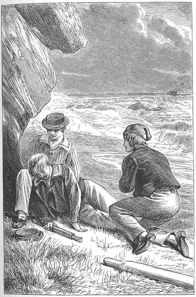 First, A small penknife with a single blade broken off about the middle and very rusty, besides having two or three notches on its edge. (Peterkin said of this, with his usual pleasantry, that it would do for a saw as well as a knife, which was a great advantage.) Second, An old German-silver pencil-case without any lead in it. Third, A piece of whip-cord about six yards long. Fourth, A sailmaker’s needle of a small size. Fifth, A ship’s telescope, which I happened to have in my hand at the time the ship struck, and which I had clung to firmly all the time I was in the water. Indeed it was with difficulty that Jack got it out of my grasp when I was lying insensible on the shore. I cannot understand why I kept such a firm hold of this telescope. They say that a drowning man will clutch at a straw. Perhaps it may have been some such feeling in me, for I did not know that it was in my hand at the time we were wrecked. However, we felt some pleasure in having it with us now, although we did not see that it could be of much use to us, as the glass at the small end was broken to pieces. Our sixth article was a brass ring which Jack always wore on his little finger. I never understood why he wore it, for Jack was not vain of his appearance, and did not seem to care for ornaments of any kind. Peterkin said “it was in memory of the girl he left behind him!” But as he never spoke of this girl to either of us, I am inclined to think that Peterkin was either jesting or mistaken. In addition to these articles we had a little bit of tinder, and the clothes on our backs. These last were as follows:—