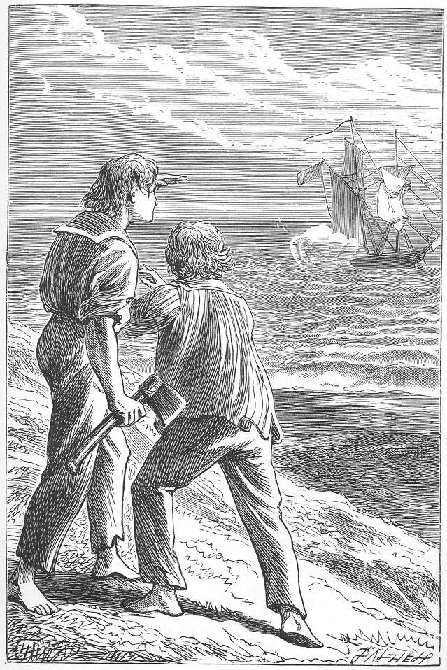 “Well, that’s better than nothing; but come,” said Jack, rising, “we are wasting our time in talking instead of doing. You seem well enough to walk now, Ralph, let us see what we have got in our pockets, and then let us climb some hill and ascertain what sort of island we have been cast upon, for, whether good or bad, it seems likely to be our home for some time to come.”