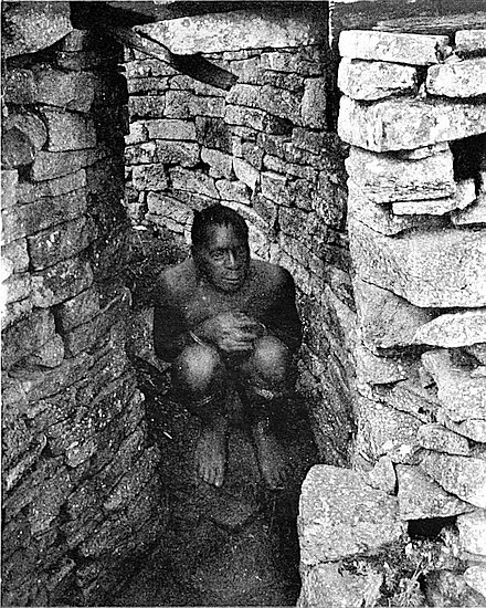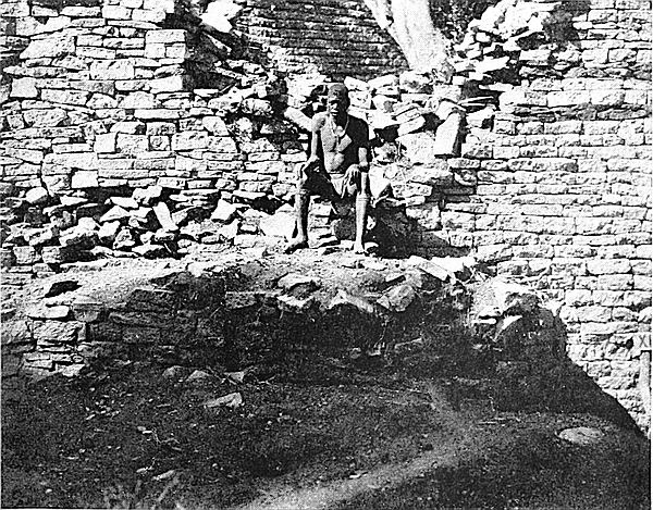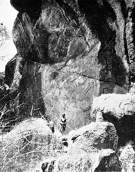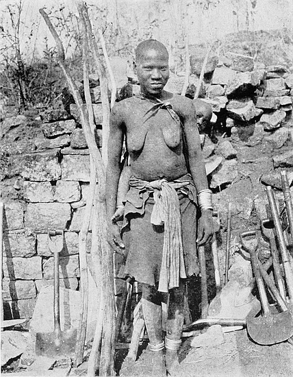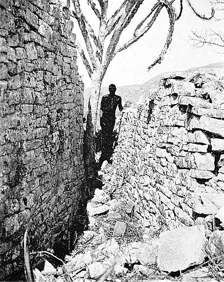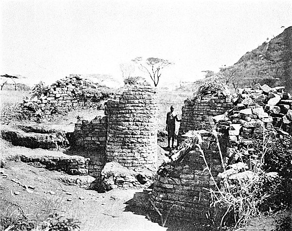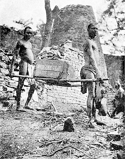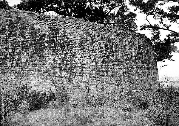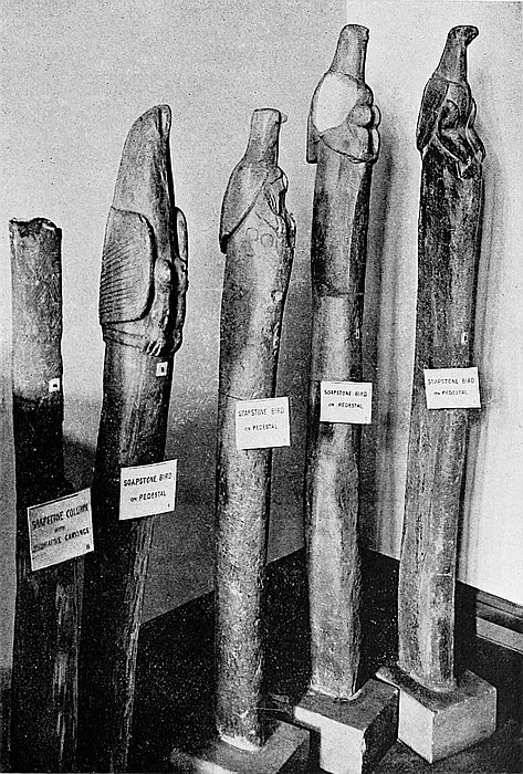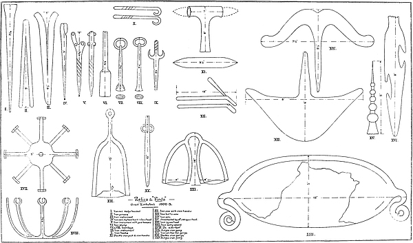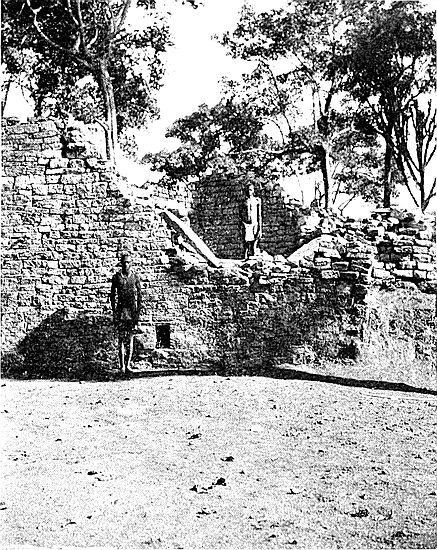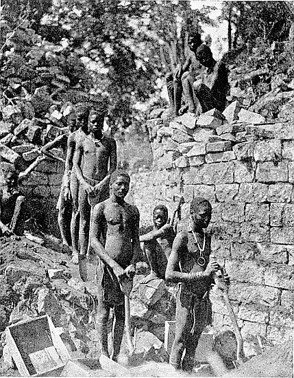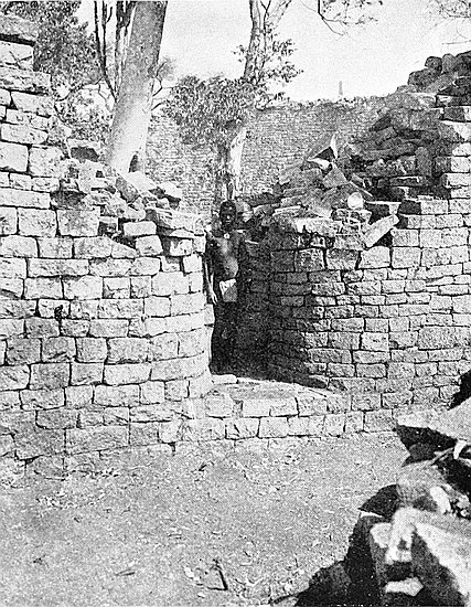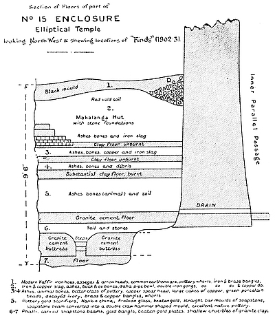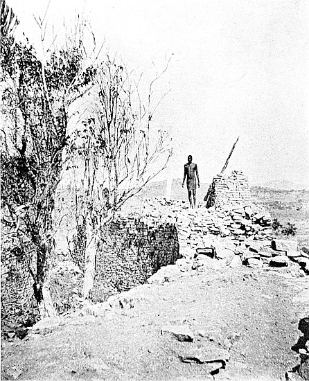 Some of the walls surrounding this area on the west and north sides, once considered to be ancient, can now be seen to cross over very old native clay huts and native copper and iron-smelting furnaces. The soil contained some phalli, which had been converted by the natives into amulets, also some Arabian glass—thirteenth and fourteenth centuries—Venetian beads, gold wire-work, beaten gold, gold scorifiers of native pottery, iron pincers, and fragments of carved soapstone bowls with geometric designs.