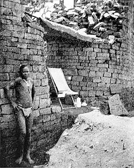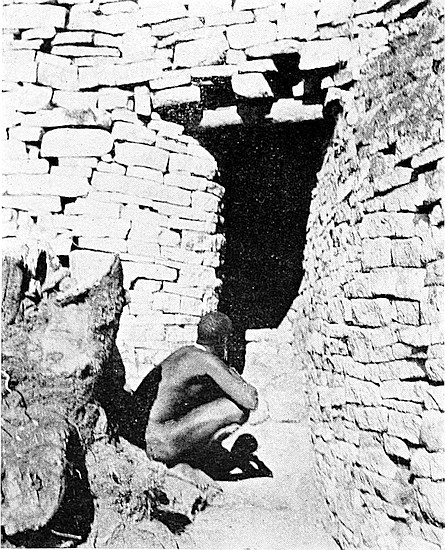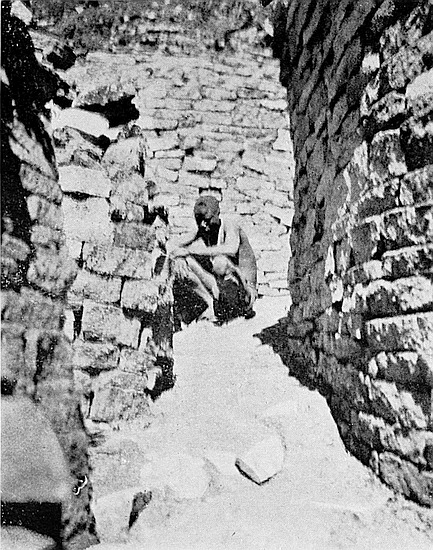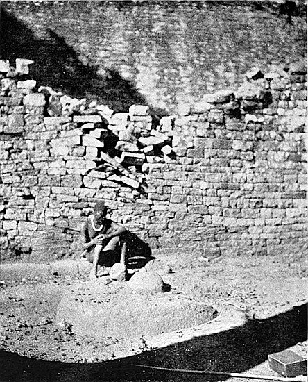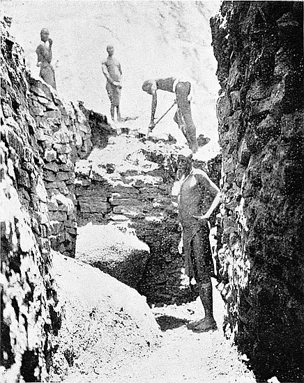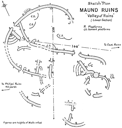 This area is only partially excavated, it being covered with old native-built walls which cross over bone and ash débris, old native huts, an iron furnace, and rich black mould in which the vegetable matter was still undecayed. Experimental holes and boring-rods showed that some very old foundations ran below the soil upon which the later and poorer walls are built. However, a key has now been found which will enable further excavations to be made within this area without injury to the upper walls.