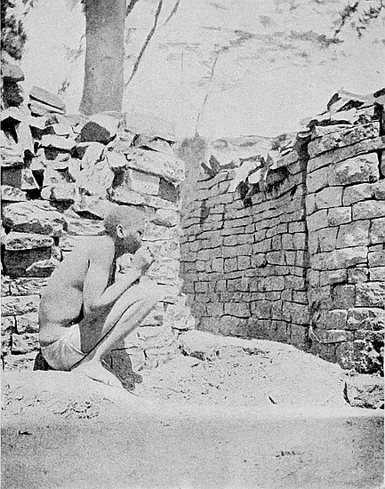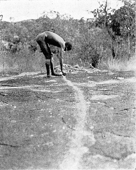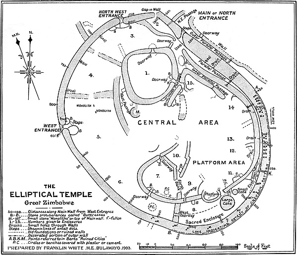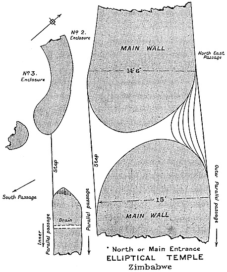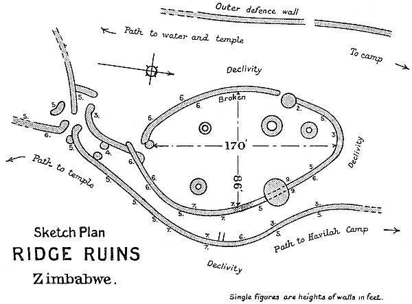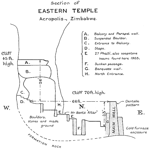 The writer is now perfectly assured that no burial-places of the original builders will be found under the interior of the Elliptical Temple or within 30 yds. of the exterior. Holes have been sunk at regular intervals within the temple and immediately outside the walls, and boring-rods have been systematically employed, and the position and lie of the formation rock ascertained throughout, so that sections and levels have been made of the soil and rock under the temple. All the results gained from each hole and boring are recorded. But beyond discovering buried foundations at the higher level, only virgin soil, never before disturbed, was gone through. French and German archæologists who visited Zimbabwe during the operations confirmed what British scientists have affirmed, that no burials of people of Semitic stock would be found within or near to any building so frequently in use as the great temple must have been. The severe restrictions with regard to cleanliness and sanitation, especially as to the dead, are among the most notable features of the old Semitic nations.