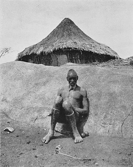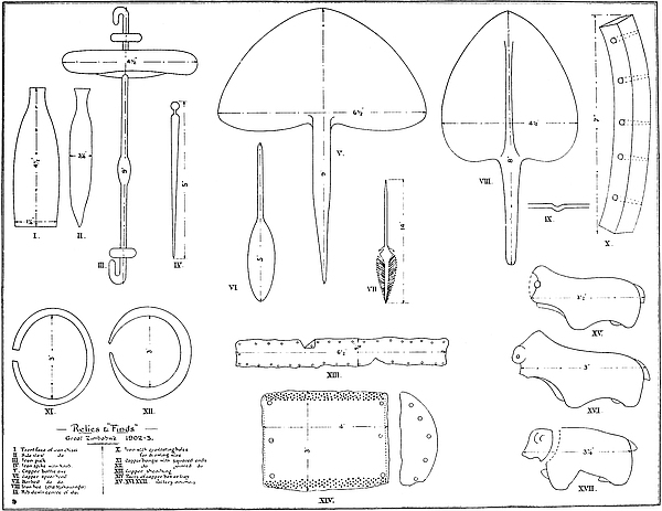 With regard to the location of the later-period gold articles there is ample evidence that these are of very old native origin. Such ornaments are commonly met with on the floors of, or in close proximity to, the old native huts of the types of Nos. 2 and 3 (see Architecture, s.s. Native Huts found in Ruins, pp. 154, 155, post), and also in the cement huts with small radiating walls on levels several feet above any ancient floorings. In every instance such gold ornaments are found in association with articles of old native make—such as double iron gongs, copper sheathing, and copper assegai- and arrow-heads.