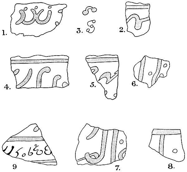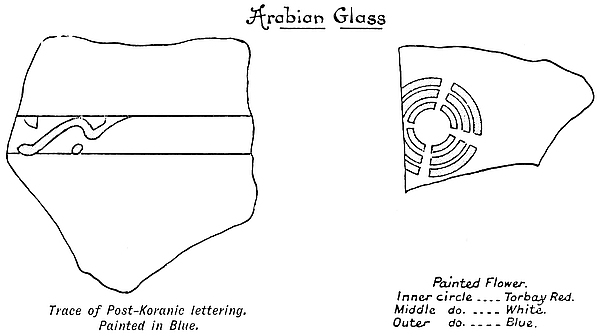 No ancient writing has been discovered, though close attention has been paid to all stones and pottery likely to bear it, and notwithstanding that the interiors of some of the more ancient portions of the ruins have been cleared down to the old floors where, if any existed, they might reasonably have been expected to be found. Post-Koranic lettering was found on highly glazed pottery, also on glass, but all such specimens are of a fragmentary character; but experts such as Mr. Wallace Budge, the Head Keeper of Egyptianxix and Assyrian Antiquities at the British Museum, state that the glass and other “finds” of pottery are not older than the thirteenth or fourteenth century of this era. Other pottery thickly covered with dull-coloured glazes—mainly purples, greens, and browns—is thought to be somewhat older than that on which the lettering was found. Still, as such a very large portion of what may be considered as the more ancient of the ruins remains to be examined, it may yet be possible to unearth older specimens of Arab writing.