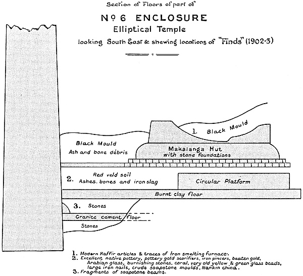 (c) Dr. Hahn, the leading expert in South Africa in chemical metallurgy, analysed the soil underlying the foundation of the west wall, and pronounced it to be composed of disintegrated furnace slag and ashes containing gold and iron. The ground to the west of the west wall has always been the spot at which gold prospectors have washed the soil for gold, and here gold crucibles and scorifiers are to be found. This soil contains 73 per cent. of silica, and would make an excellent foundation for walls, and the west wall is built right along this bed of furnace slag, which is about 2 ft. in depth, many yards wide, and extends from north to south.