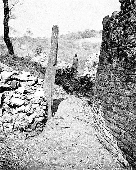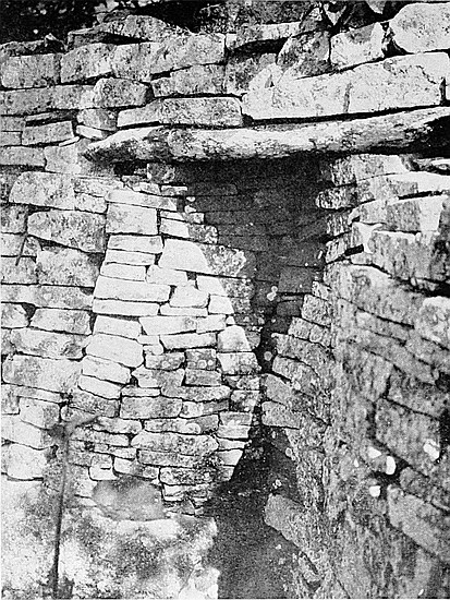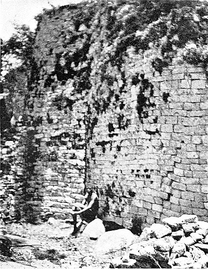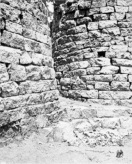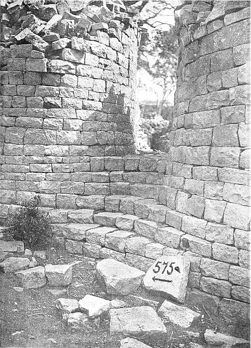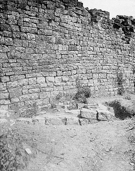 (b) In 1903 the writer cleared the soil away from the gap between the older and later walls, and found that they were widely different in construction; that the later and narrower wall approached the older and well-built and wider wall at an oblique angle; and that the end of the older wall is broken and not finished off as are other ends of ancient walls. In a trench made at a distance of twelve yards west of the gap, and on the curve the older wall, if continued, would have passed, a mass of buried masonry, which might have been a portion of the old wall, was disclosed.